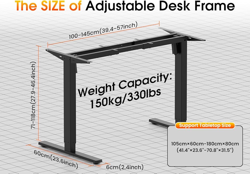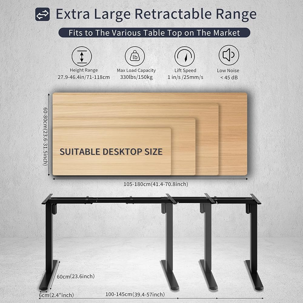 【تعديل الارتفاع الكهربائي والتوافق مع سطح المكتب】----- يتميز إطار المكتب القابل للتعديل كهربائيًا بارتفاع عمل قابل للتعديل من 27.9 بوصة (بدون سطح المكتب) إلى أقصى ارتفاع يبلغ 46.5 بوصة. قابلة للتعديل لتناسب مجموعة واسعة من أحجام سطح المكتب، وتتميز أرجل المكتب الدائمة بقضبان عرضية يمكن أن تمتد من 39.4 بوصة إلى 57.1 بوصة في الطول. حدد اختيارك لسطح المكتب من 41.4 بوصة إلى 70.8 بوصة في الطول و23.6 بوصة إلى 31.5 بوصة في العمق لدمج إطار المكتب الدائم مع إعدادات منزلك ومكتبك.