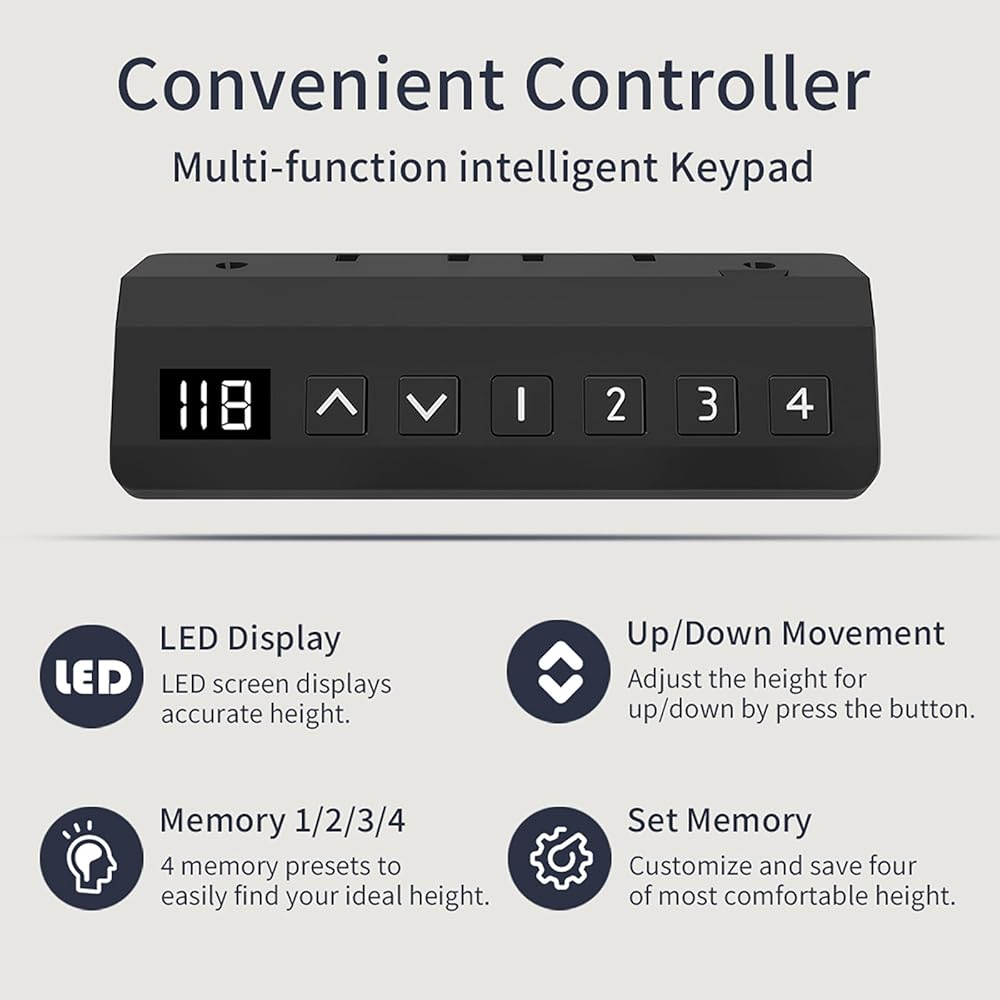【لوحة تحكم متعددة الوظائف وتقنية مضادة للتصادمات】----- تتميز وحدة التحكم بزر الضغط سهلة الاستخدام هذه بـ 4 إعدادات للذاكرة لحفظ الارتفاعات المرغوبة. بضغطة زر واحدة فقط، يمكنك ضبط الارتفاع دون عناء. إطار المكتب مزود بتقنية مقاومة الاصطدام، مما يحميه من الصدمات والخدوش عن طريق استخدام أجهزة استشعار للكشف عن العوائق في طريقه.