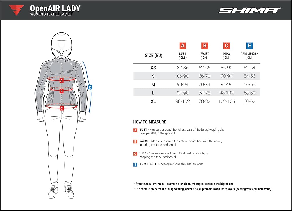 The OpenAIR Lady jacket will be perfect for users who ride in high temperatures. All its features are focused towards comfort. The lightweight mesh fabric combined with certified hi-flow protectors is designed to hold the body well under impact, while providing good ventilation. The special shape of the protectors with a two-layer honeycomb structure provides effective protection and maximum air permeability. For additional safety the jacket is equipped with a CE level 2 back protector with the same technology and structure as the elbows and shoulders. This single-layered jacket has a short zipper and a connecting loop which allows it to be fastened to SHIMA trousers. The waist width can be adjusted to fit the body easily and the EvoLINK system allows the jacket to be combined with optional heating or cooling layers if required. With the OpenAIR LADY jacket even the hottest day can be a riding day.