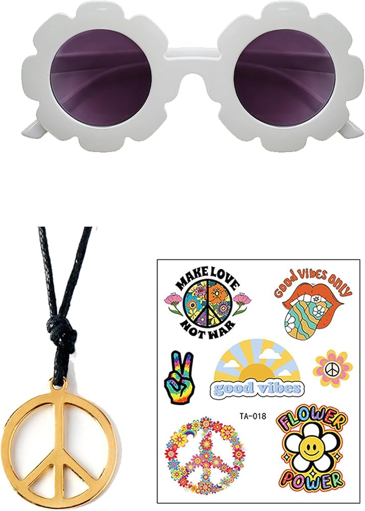 Flower headband, hippy glasses,peace sign hippie tattoo sticker and necklace set are a great costume accessories addition for a hippie theme party