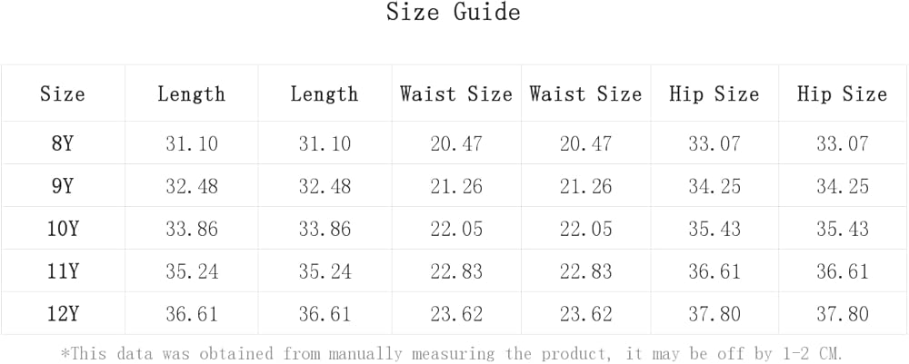 12Y:Hip Size:37.8IN,Length:36.6IN,Waist Size:23.6IN,Hip Size:37.8IN,Length:36.6IN,Waist Size:23.6IN