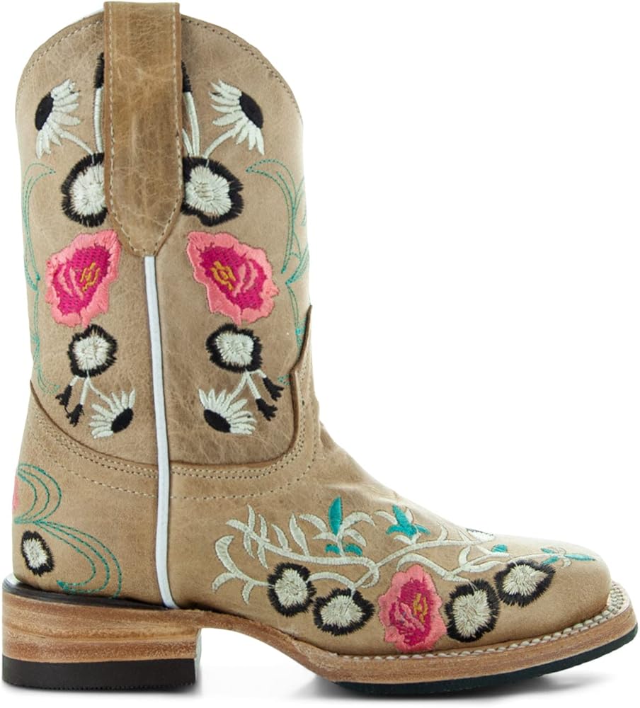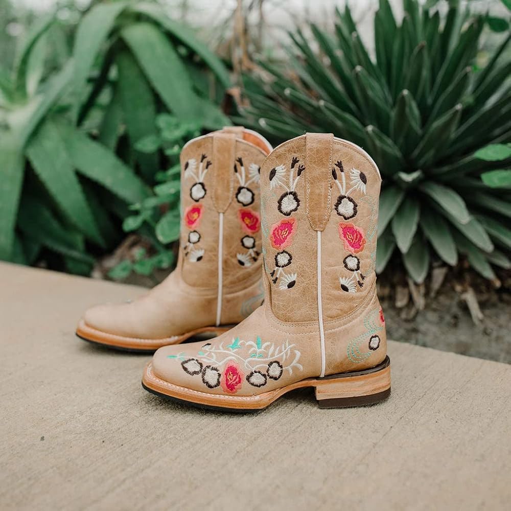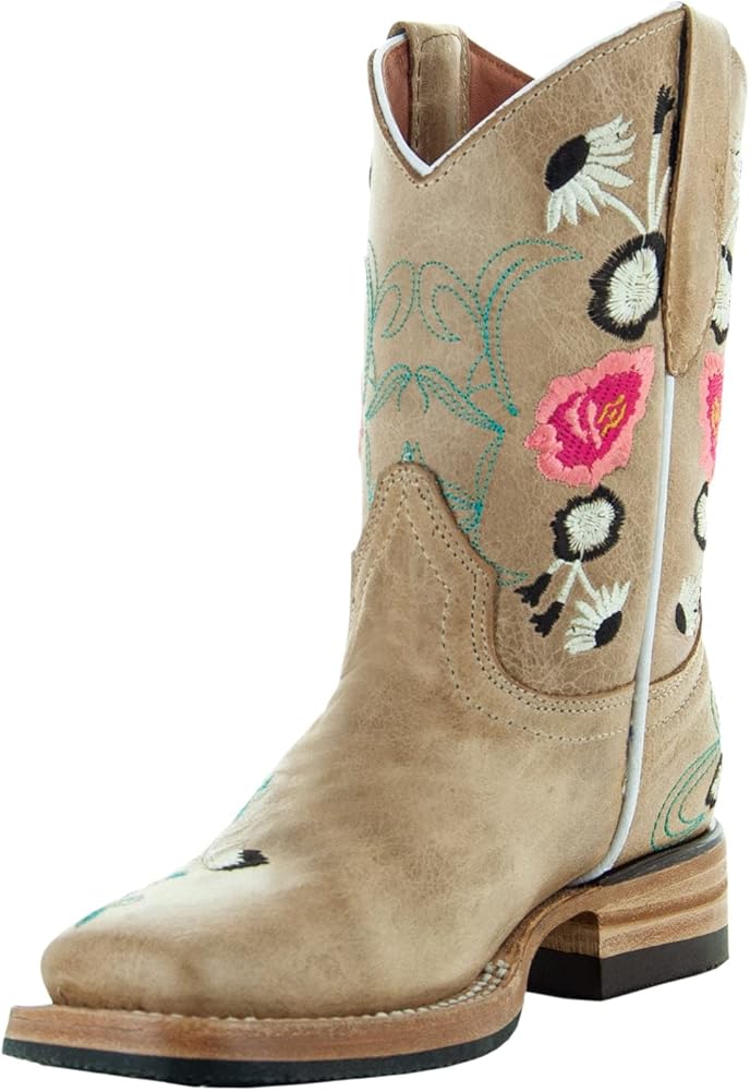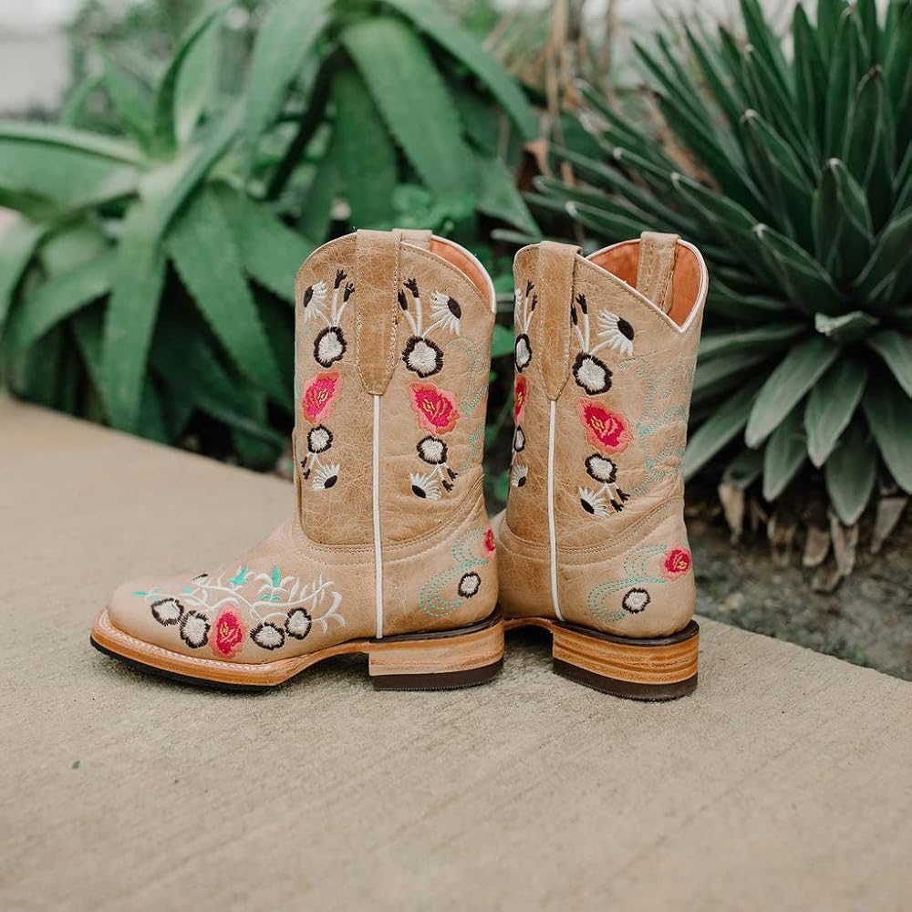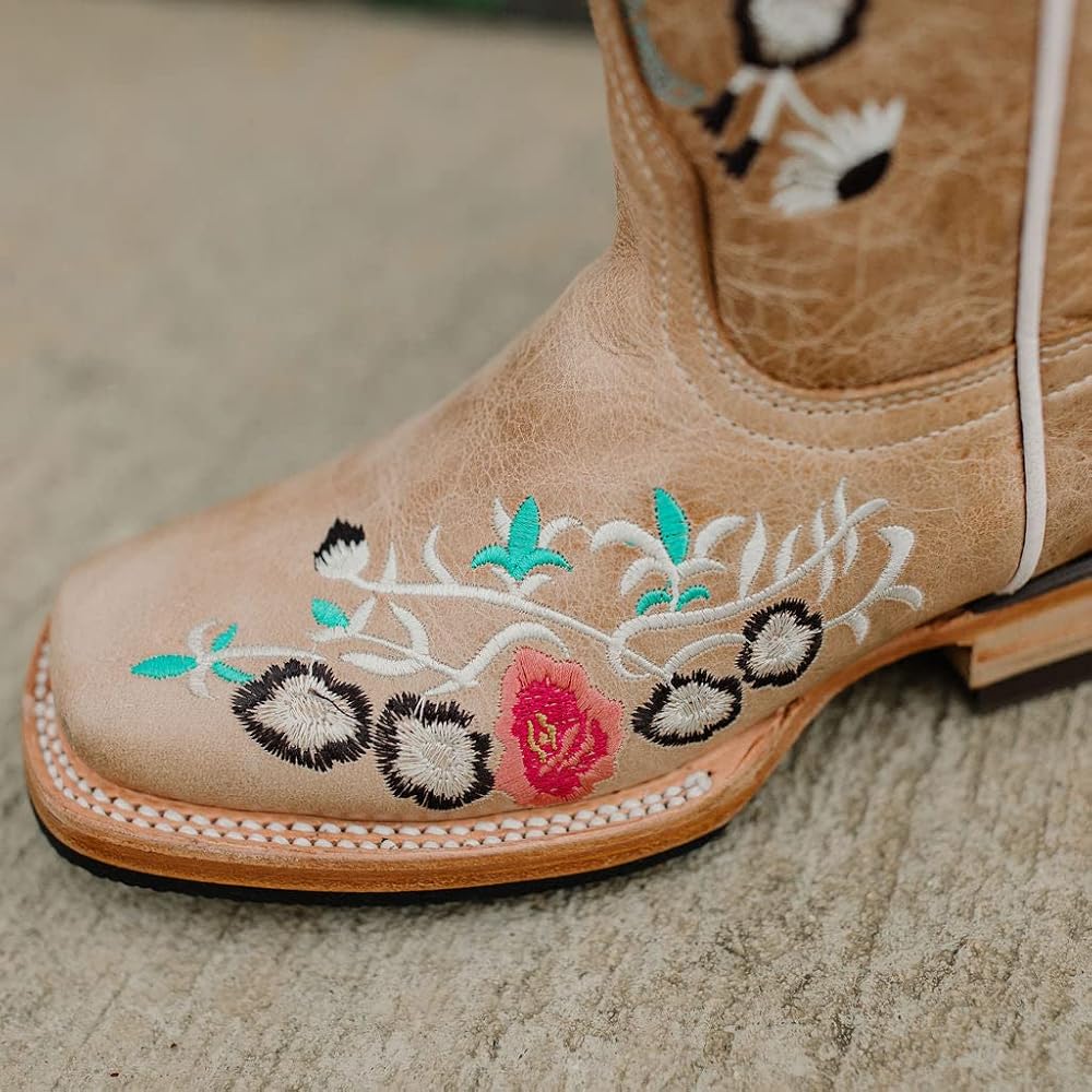 A beautiful floral embroidery design on a Sand Square Toe Cowboy Boot