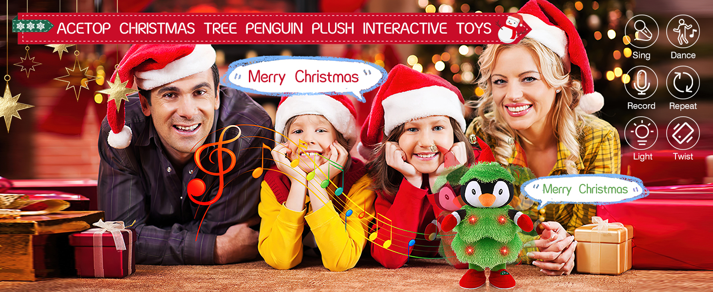 شجرة عيد الميلاد الموسيقية LED، البطريق الحيوان المحشو يكرر ما تقوله، تضيء لعبة قطيفة ناعمة تغني وترقص وتتحدث وتحاكي التواء الدمى المتحركة التفاعلية لتزيين هدايا عيد الميلاد