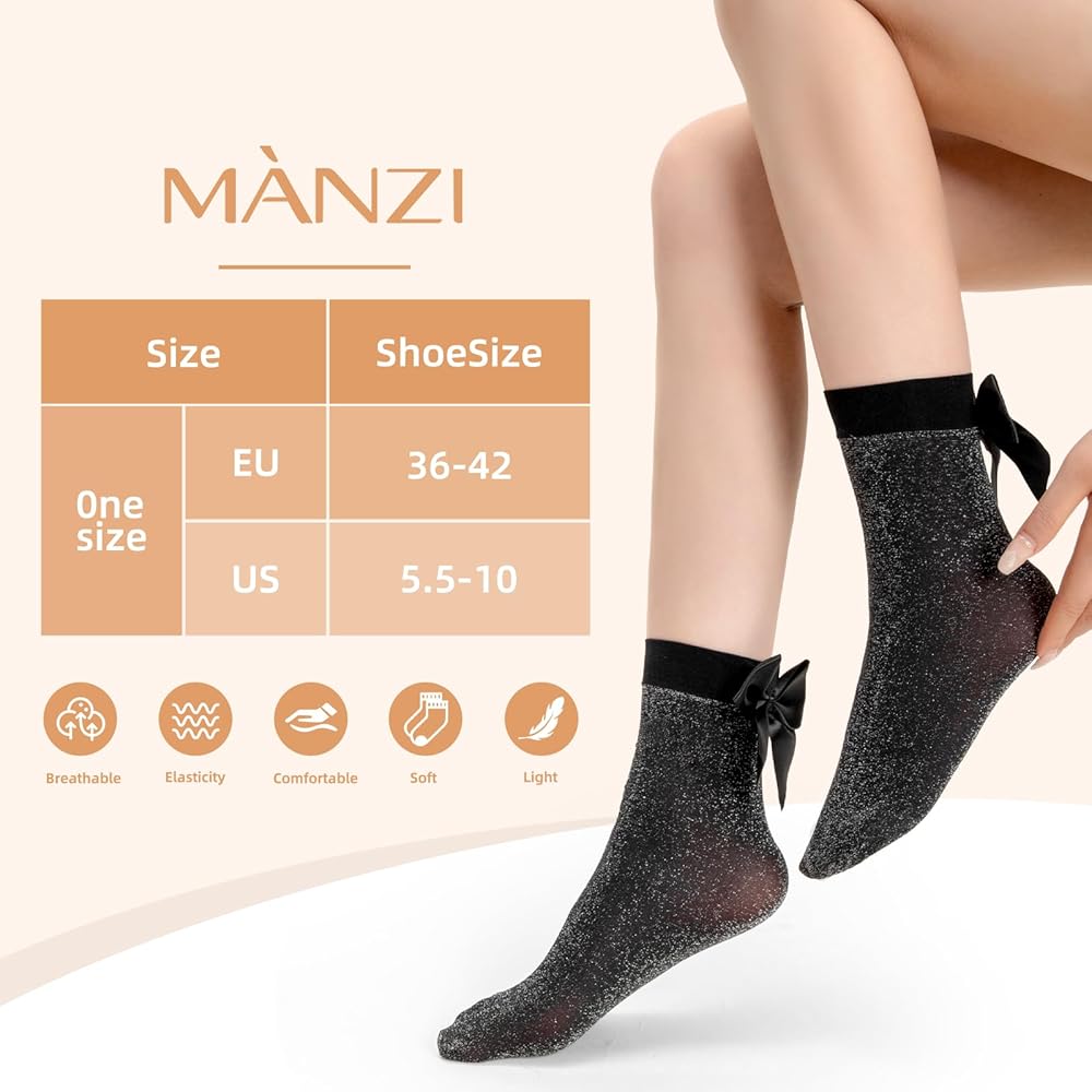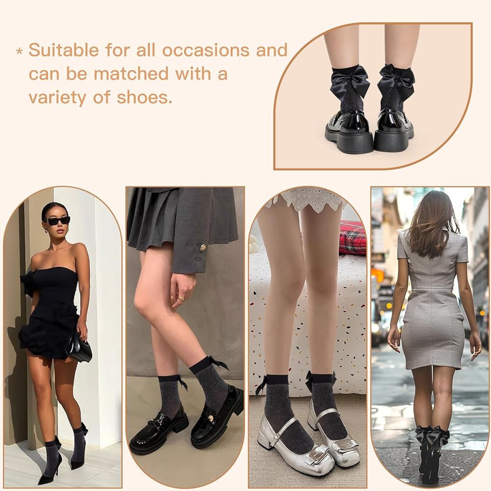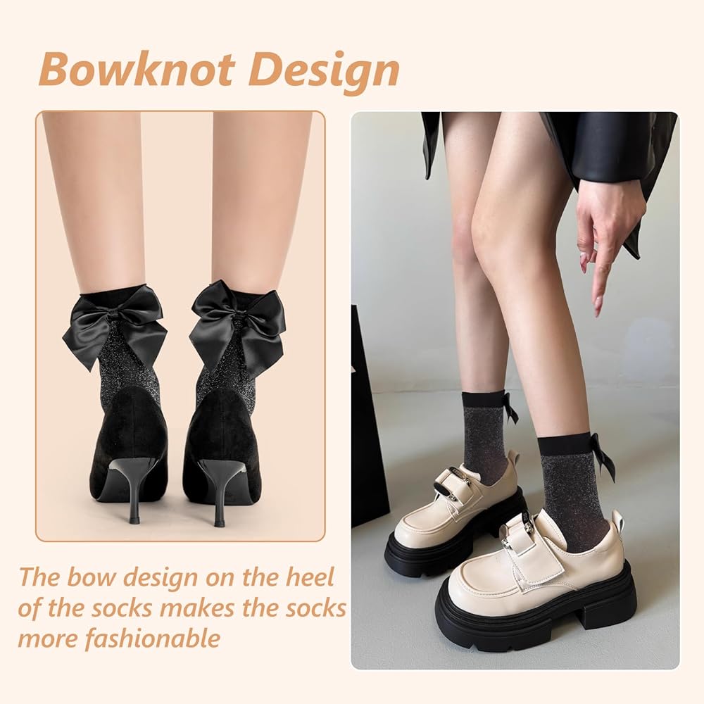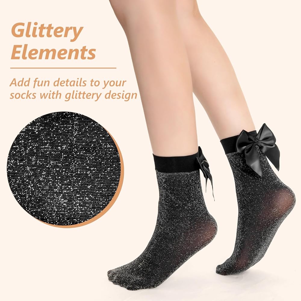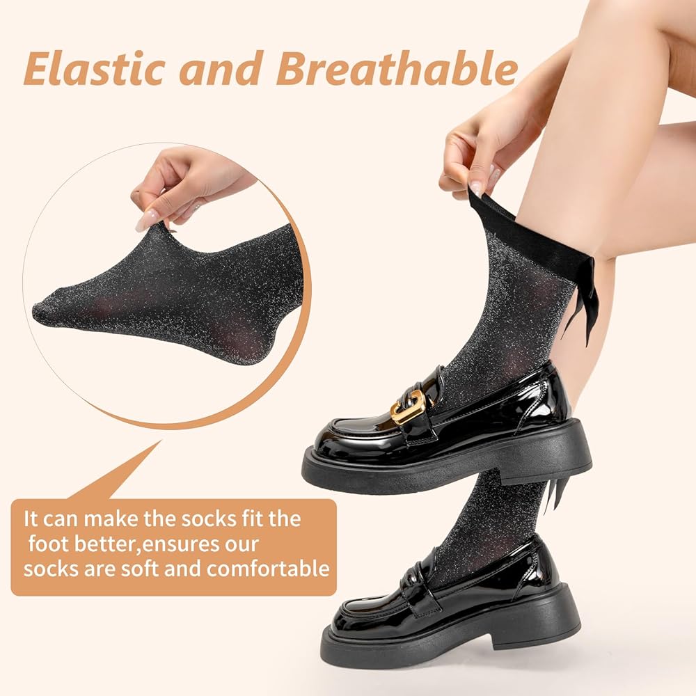【تصميم لامع】هذه الجوارب اللامعة ذات القوس مصنوعة من خيوط معدنية لامعة، مع تصميم لامع وناعم كالحرير المتلألئ على قدمك، مما يسلط الضوء على سحرك.