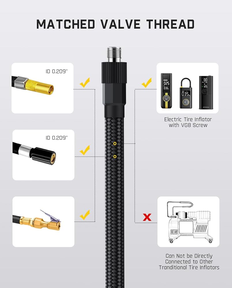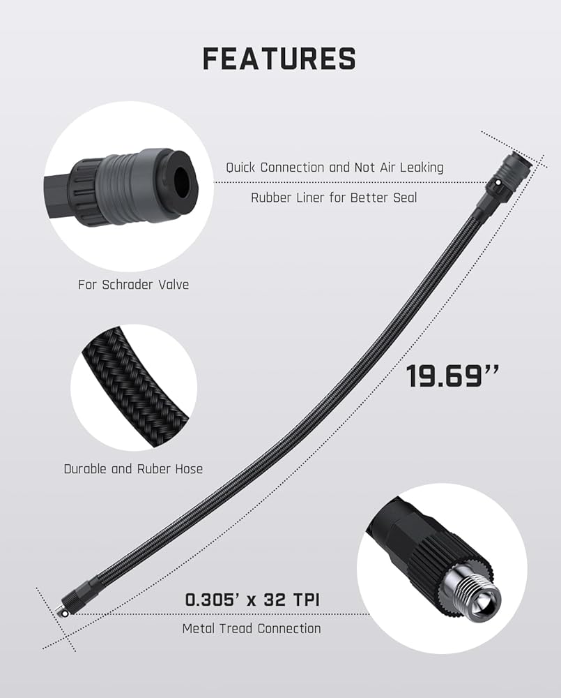 [قابل للاستعمال على نطاق واسع] يدعم هذا الخرطوم صمام شريدر القياسي، خرطوم تمديد 19.96 بوصة مناسب لمعظم إطارات المركبات، مثل السيارات والدراجات النارية والدراجات (ليس لدراجات الطرق). مع وصلة لولبية VG8/8V1 القياسية، يمكن توصيلها بمعظم منفاخ الإطارات في السوق.