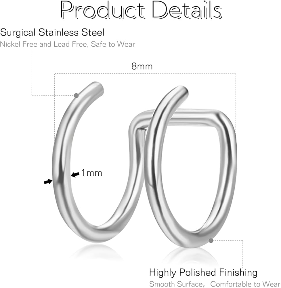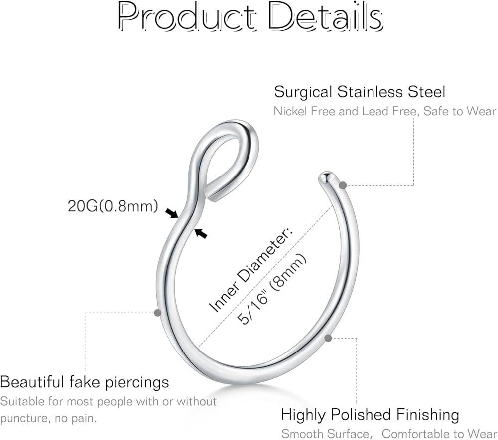 القياسات: حلقة أذن وهمية بدائرة مزدوجة - القياس: 18 جرام، القطر الداخلي: 8 مم؛ حلقة أنف وهمية - المقياس: 20 جرام، القطر الداخلي: 8 مم؛ أزرار أنف وهمية - القطر: 3 مم. يرجى التحقق من مقاسك قبل الشراء!