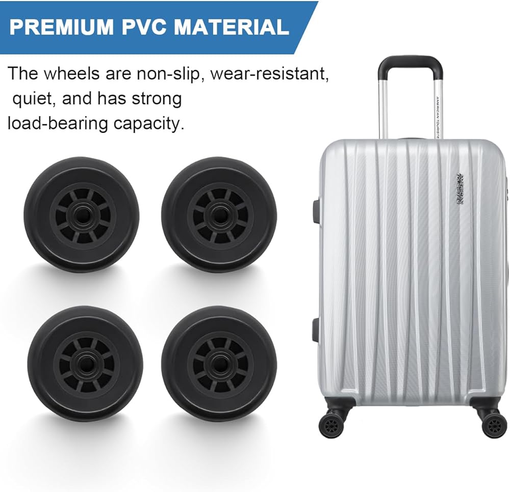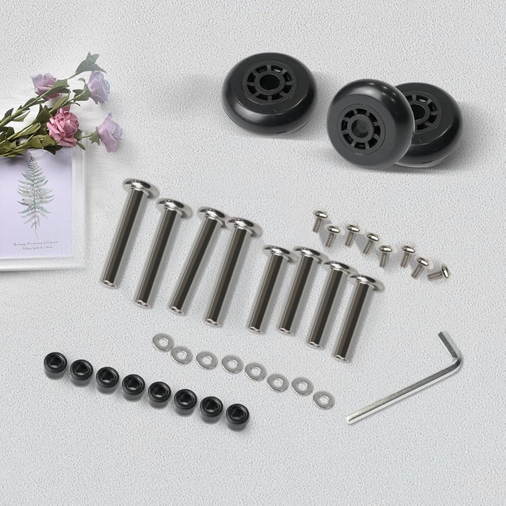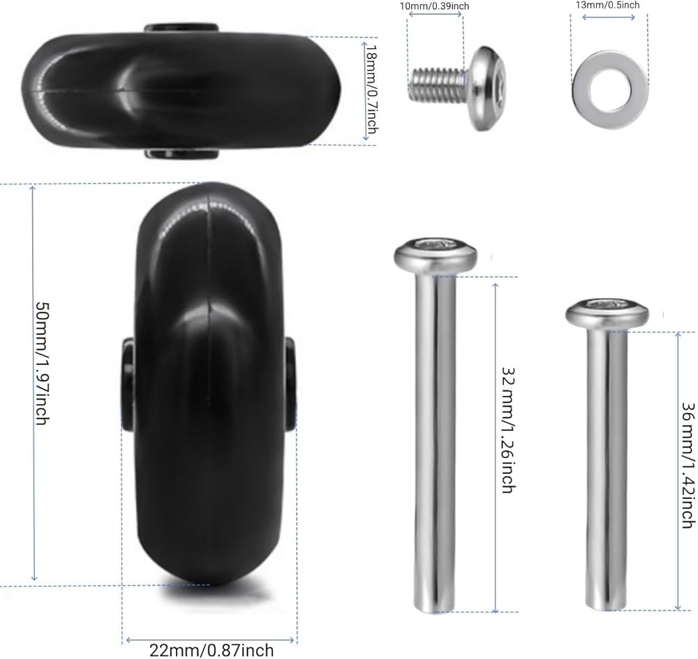 Luggage Wheels Replacement Kit: Include 8 x 50mm diameter suitcase replacement wheels, 4 x 40mm wheel axles, 4 x 45mm wheel axles, 8x Axles screws, 8 x Washers, 1x Wrenches. Please measure the wheel diameter, thickness and axle size of your suitcase before purchasing, and refer to the size in the picture to purchase the appropriate product.