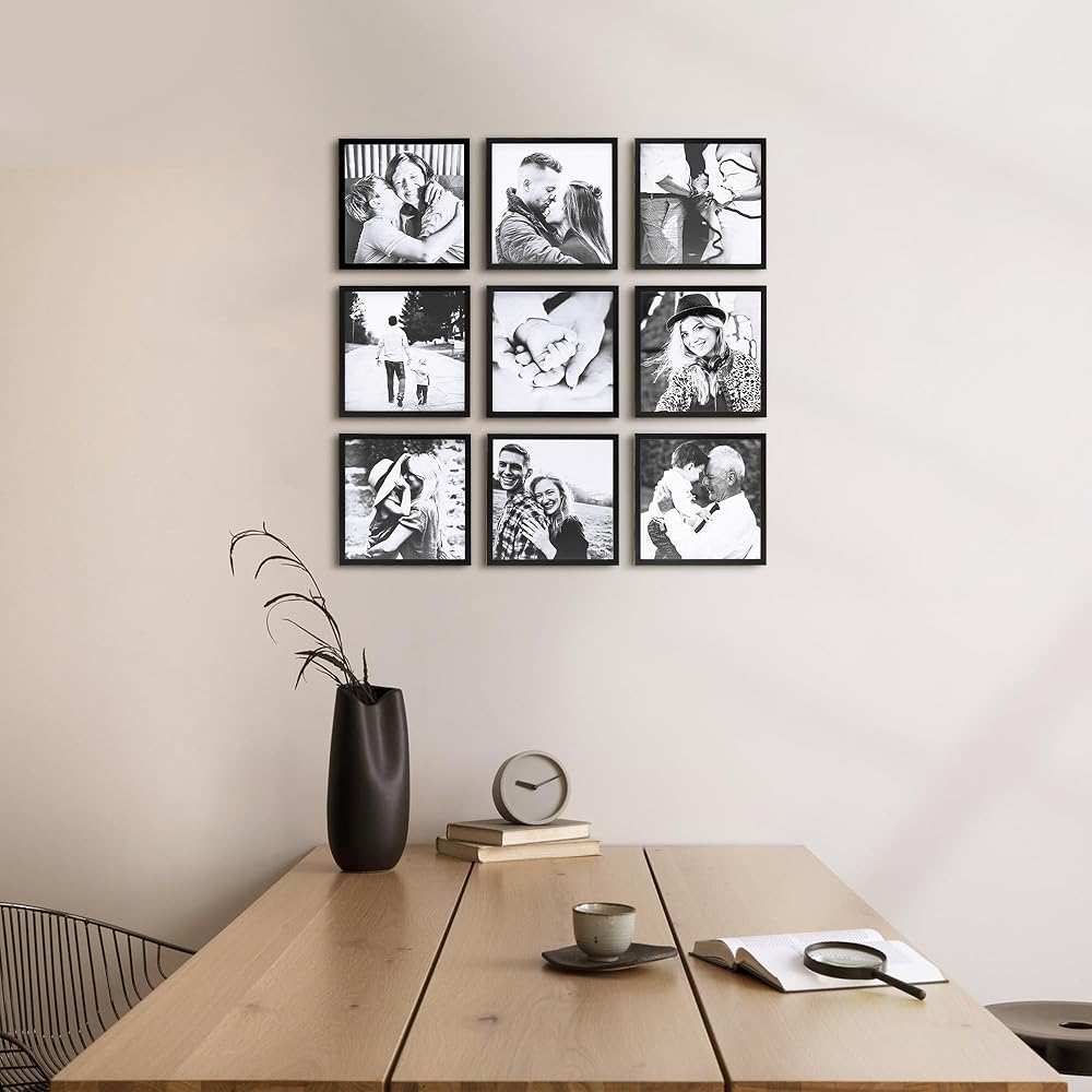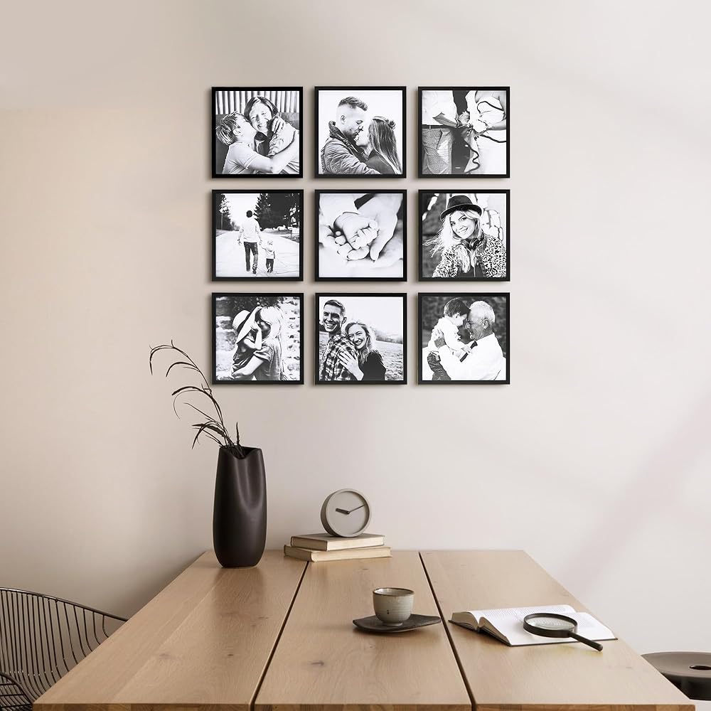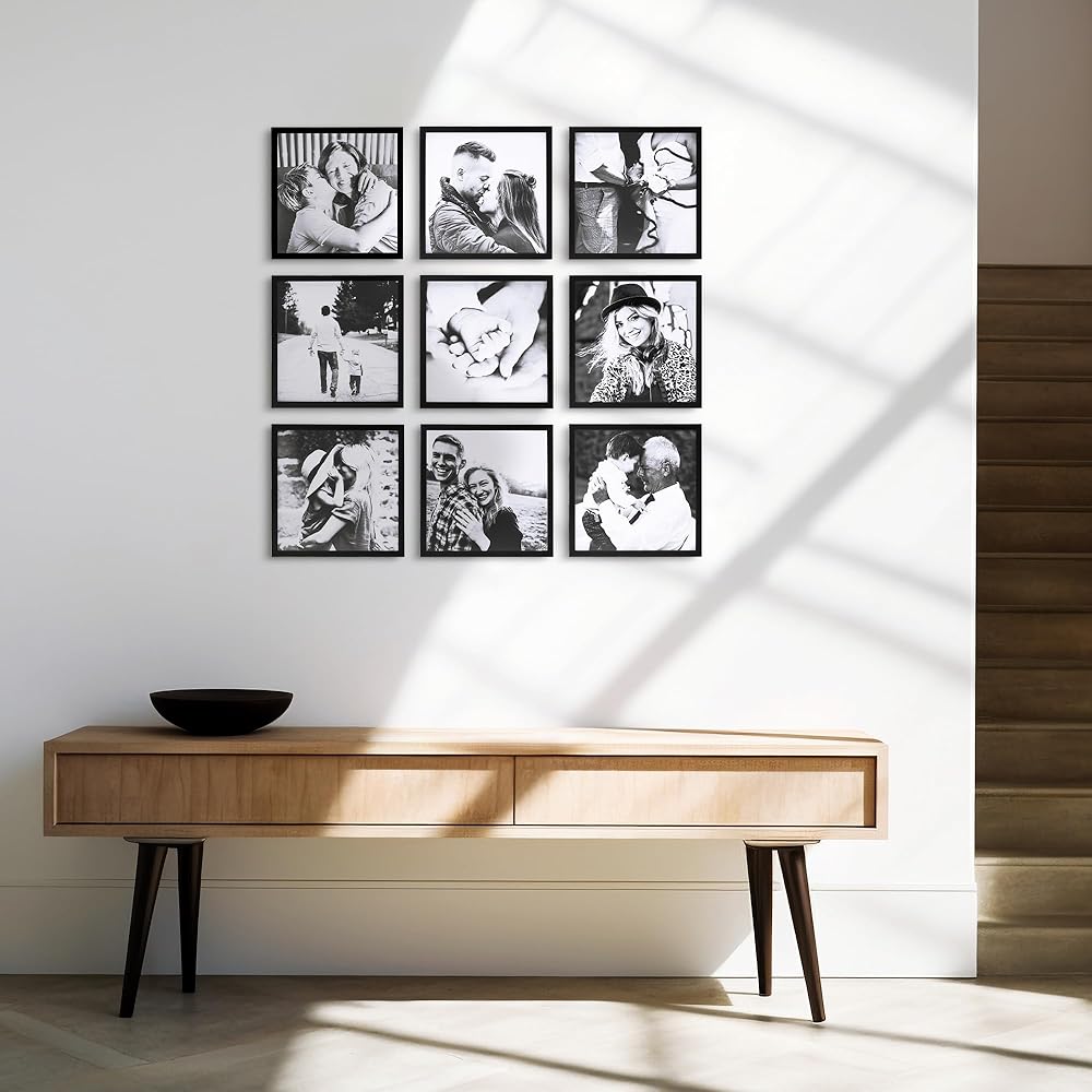 مجموعة إطارات حائط ArtbyHannah Gallery مكونة من 9 إطارات صور مربعة مقاس 8x8، إطارات صور سوداء تستخدم كإطارات صور مقاس 8x8 بدون حصيرة للتركيب على الحائط في المعرض