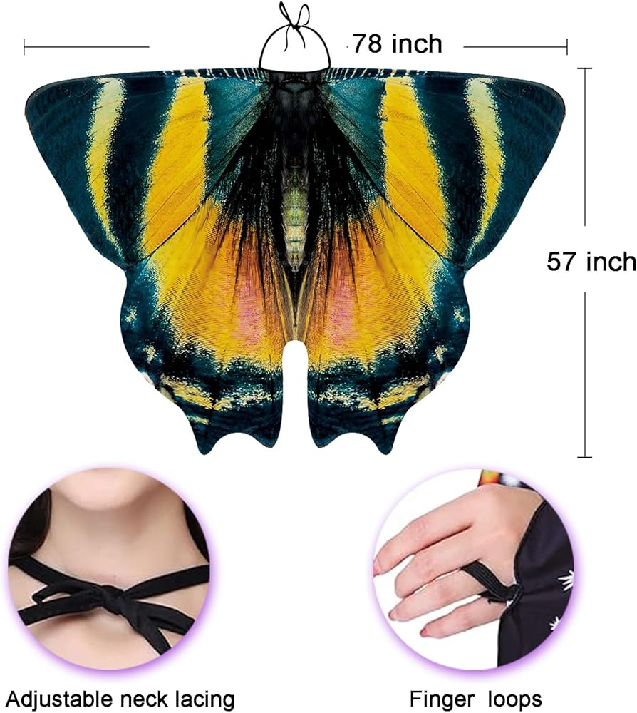 أزياء الهالوين للبالغين بأجنحة الفراشة مقاس كبير - مقاس غطاء الفراشة 78 × 57 بوصة. زي الفراشة بأجنحة الفراشة مصنوع بشكل أساسي من الشيفون، ناعم وحريري الملمس، مسامي وصديق للبشرة، خفيف الوزن، لذلك يمكنك ارتداؤه براحة.