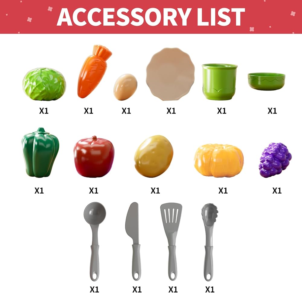 【مجموعة لعب المطبخ الفاخرة للأطفال】يوجد 18 قطعة من ألعاب حوض المطبخ، بما في ذلك 1* حوض المطبخ، 1*صنبور، رف الأطباق*1، 4* ملاعق أو شوك، 1* طبق، 1* كوب، 1* وعاء، 7* الفواكه أو الخضروات، وما إلى ذلك، والتي يمكن أن تساعد الأولاد والبنات على فهم لوازم المطبخ بشكل أفضل وتعلم بعض المعرفة بالمطبخ لمرافقة الأولاد والبنات في سن 1-4 سنوات لينمو بشكل أفضل.