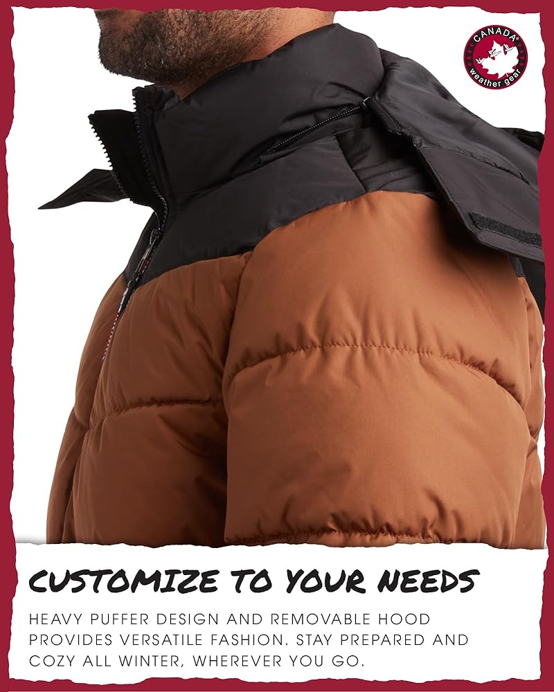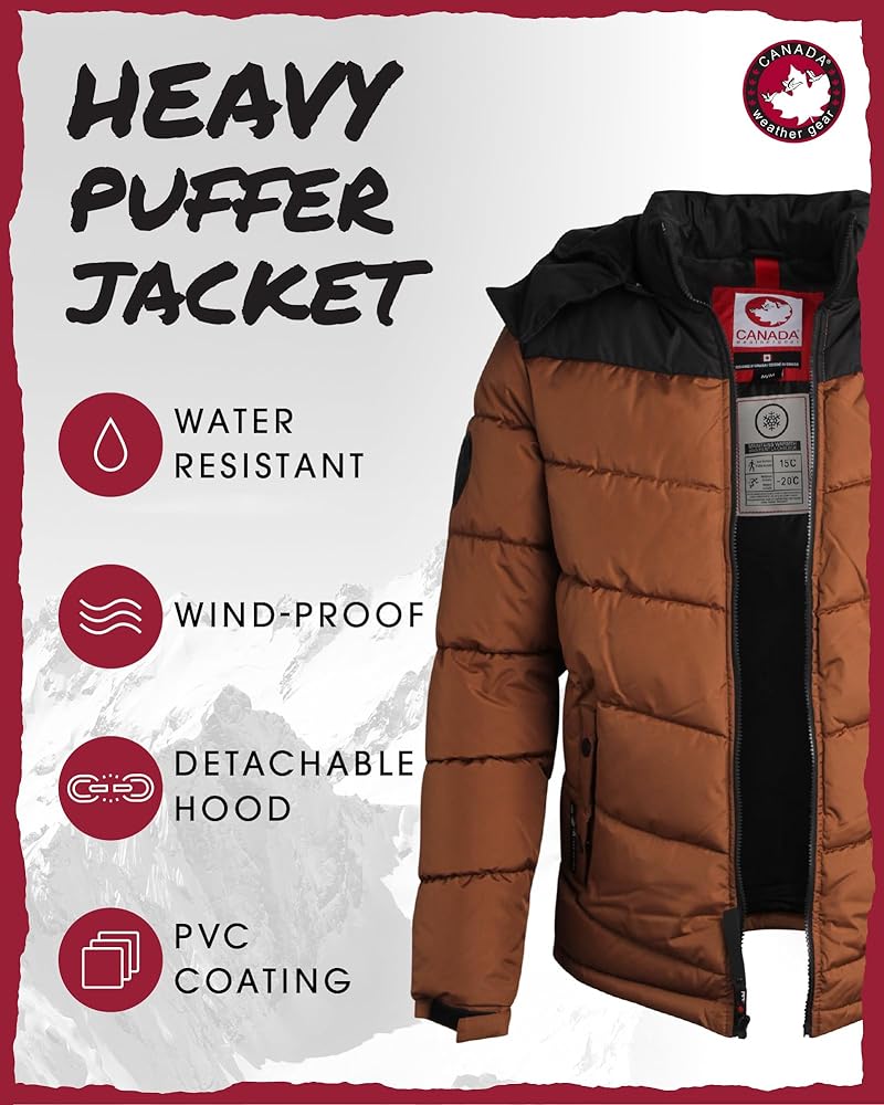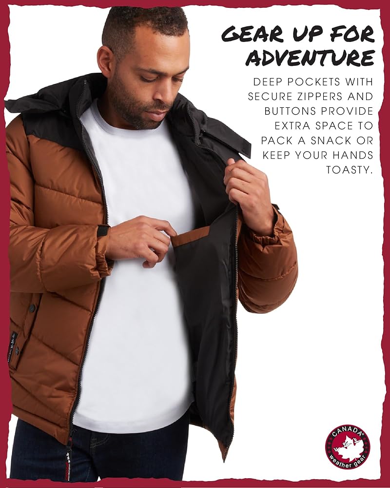• OFFICIALLY LICENSED CANADA WEATHER GEAR: Men's Puffer Jacket; We embrace all weather and all of the traditions that come with it, providing affordable, on-trend apparel and outerwear made for cozying it up or countering the cold