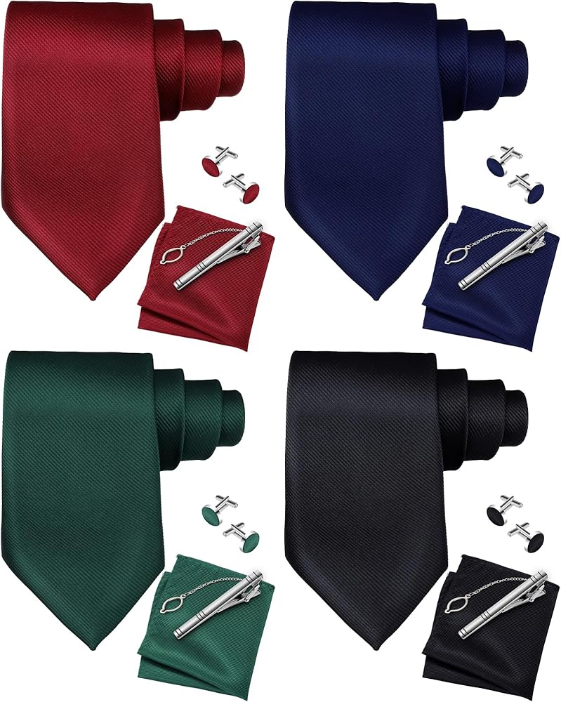 • Complete Set: you receive 4 sets of ties and pocket squares, each containing 1 necktie, 1 pocket square, 1 clip, and 2 cufflinks; This bundle offers a comprehensive collection for a coordinated and stylish appearance