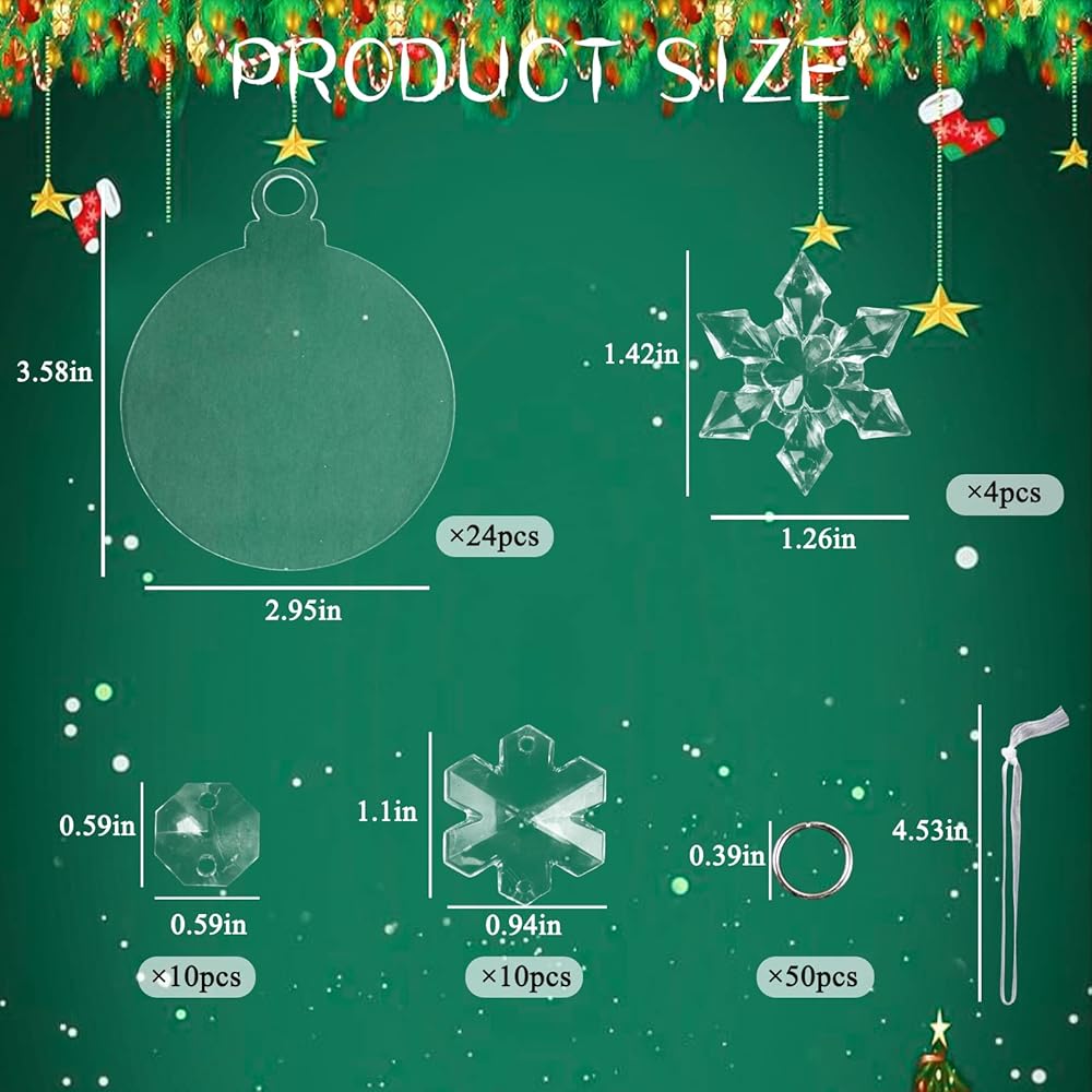 العبوة: سوف تحصل على 18 قطعة من الفراغات الأكريليك المستديرة غير المكتملة من أجل زينة أكريليك سهلة لعيد الميلاد، بما في ذلك 24 قطعة من الزينة المستديرة من الأكريليك الشفاف مقاس 3 بوصات، و14 قطعة من قلادات ندفة الثلج الكريستالية المعلقة (نمطين)، و10 قطع من الخرز الأكريليك متعدد الأضلاع، و50 قطعة من الحلقات المعدنية والأشرطة البيضاء