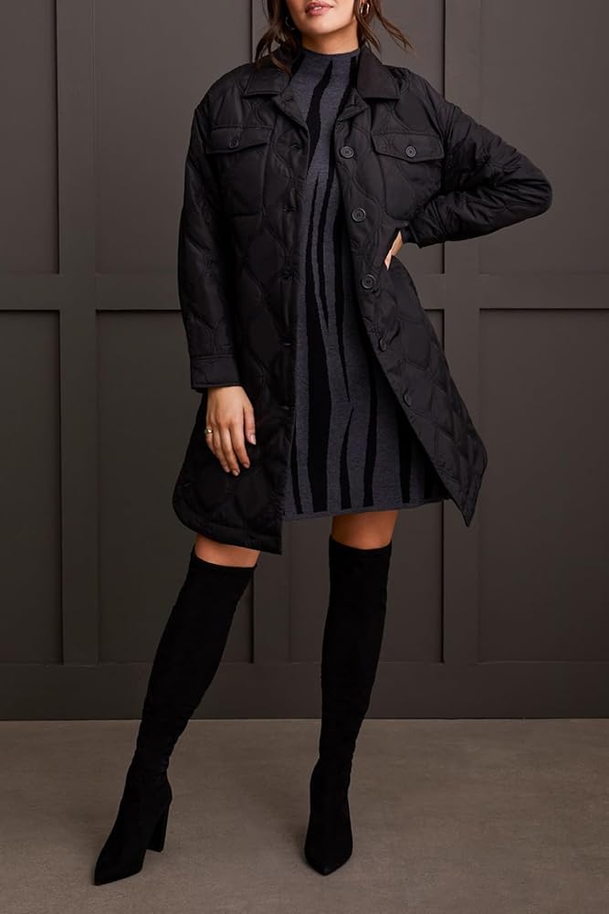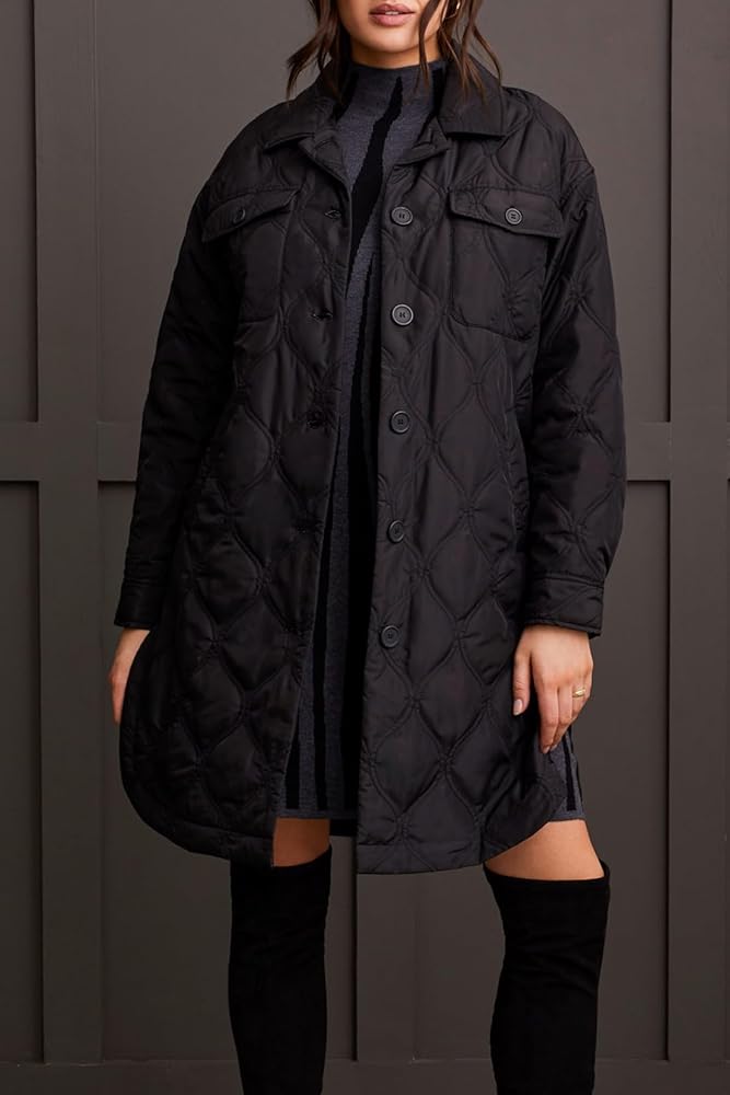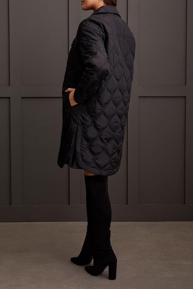 Brave chilly days with style and confidence in our sophisticated button-up jacket, featurig a cozy and stylish quilted design. Featuring timeless details such as a classic collared neckline, laid-back drop-shoulder sleeves, and practical patch pockets on the chest, along with convenient welt pockets at the sides, it effortlessly combines functionality with fashion. With a flattering 39" length, it's the perfect outerwear piece to elevate your cold-weather wardrobe.