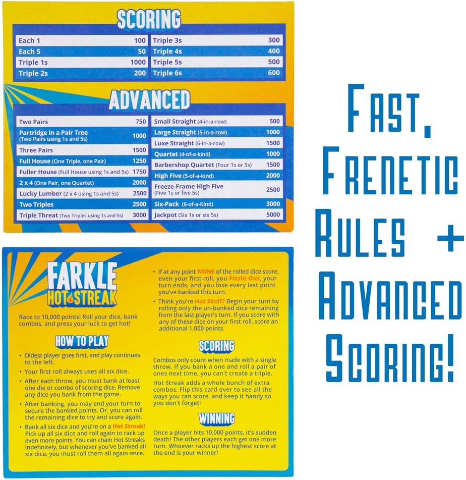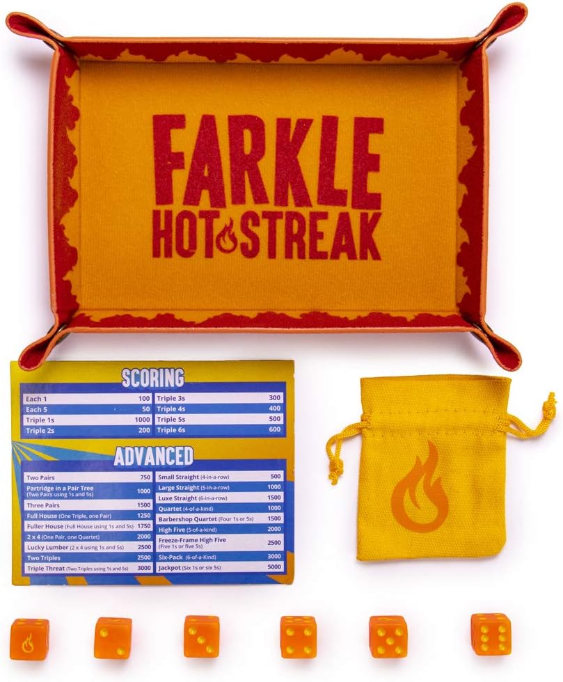Farkle is your classic dice-chucker. Roll the dice, bank some points, then press your luck! Roll again to score more points, but, if they come up duds, you fizzle out and lose everything! Farkle Hot Streak Hot Streak adds sizzle with all sorts of new scoring plays with extra bonuses for ones and fives. Bank a Pair and a Quartet for a 2x4, or bank two Triples using ones and fives for a Triple Threat and watch your score explode! This set features six flamin' hot dice, a custom Farkle Hot Streak dice tray, a fiery storage pouch, and the Farkle Hot Streak rule set, complete with scoring and advanced scoring on an instructions card. Why You'll Love It It'a a high-octane dice game that'll have you firing off dice rolls, pressing your luck, and blazing a Hot Streak! Can't stand the heat? Play classic Farkle or any other variation you want! It's a scorching-hot addition to dice and party game nights and an excellent add to any Farkle enthusiast's collection.