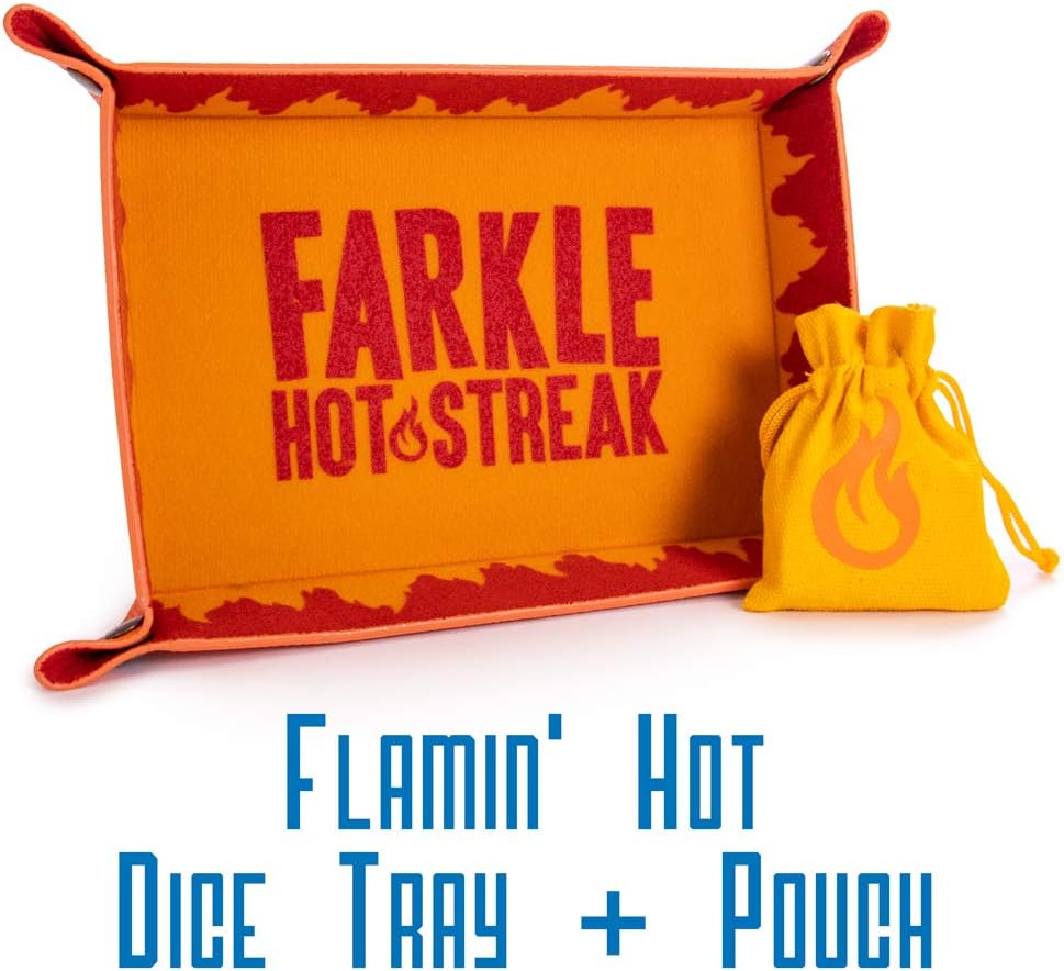 This set features six flamin' hot dice, a custom Farkle Hot Streak dice tray, a fiery storage pouch, and the Farkle Hot Streak rule set, complete with scoring and advanced scoring on an instructions card