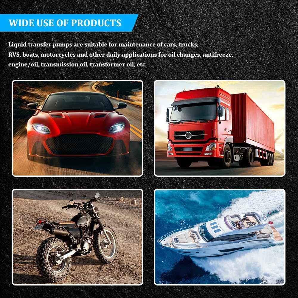 • [Widely used] : The oil extractor pump can be applied to the maintenance of cars, trucks, trucks, motorhomes, motorcycles and ships and other daily applications, can be used for oil change, transformer oil, transmission oil, engine/oil, antifreeze, etc, a variety of functions, the transmission fluid transfer extractor kit can be used in a variety of aspects, to meet different needs, and well simplify the maintenance process of vehicle/Marine engines, extremely practical.