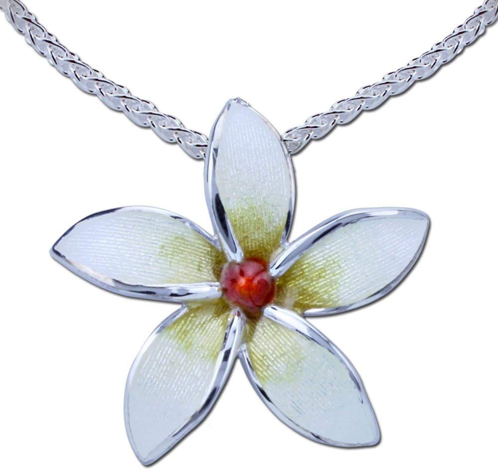 This elegant Plumeria Flower necklace is a delightful edition to the Guy Harvey Artist's Collection. The enameling technique used for the Plumeria flower is known as "Basse-taille" from the French word meaning "low-cut". The surface of the metal is decorated with a low relief design which can be seen through translucent and transparent enamels. The necklace comes complete with a sterling silver chain that adjusts from 16 to 18 inches. Each piece comes with a numbered certificate of authenticity and gift pouch. 7/8 Inch High x 7/8 Inch Wide.