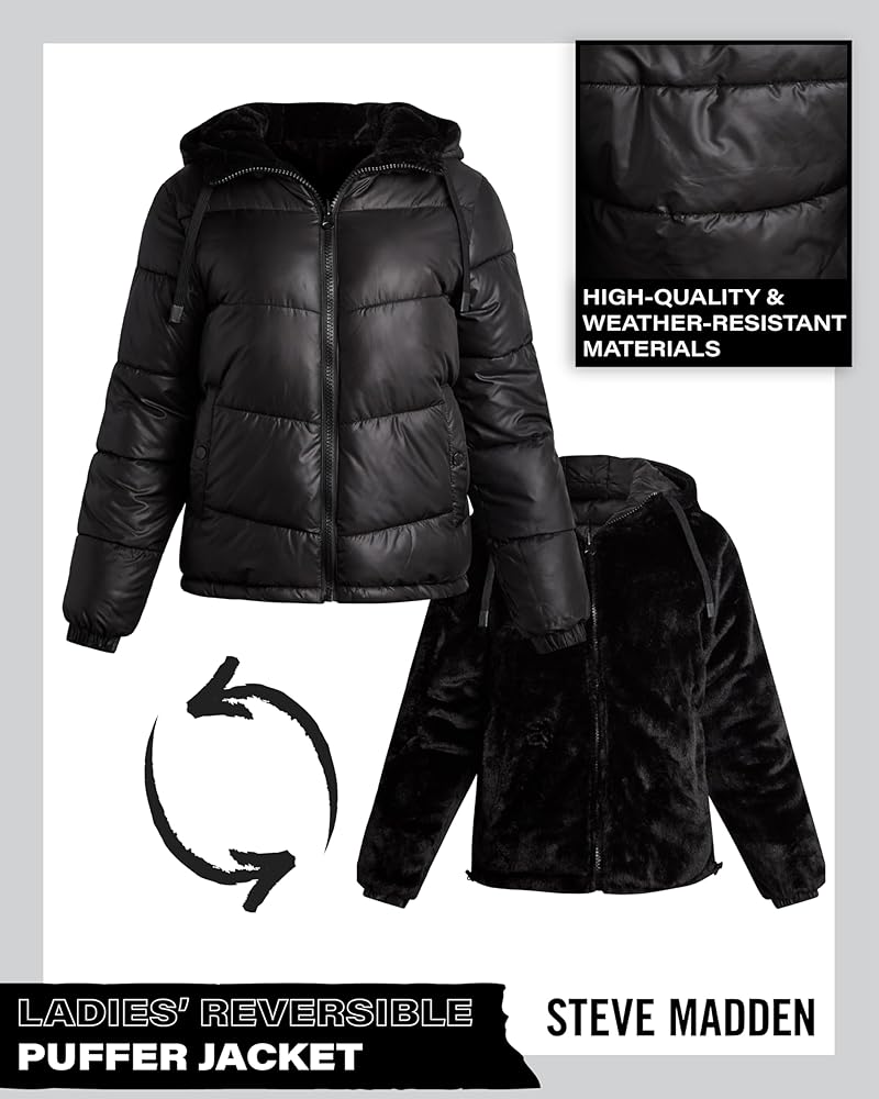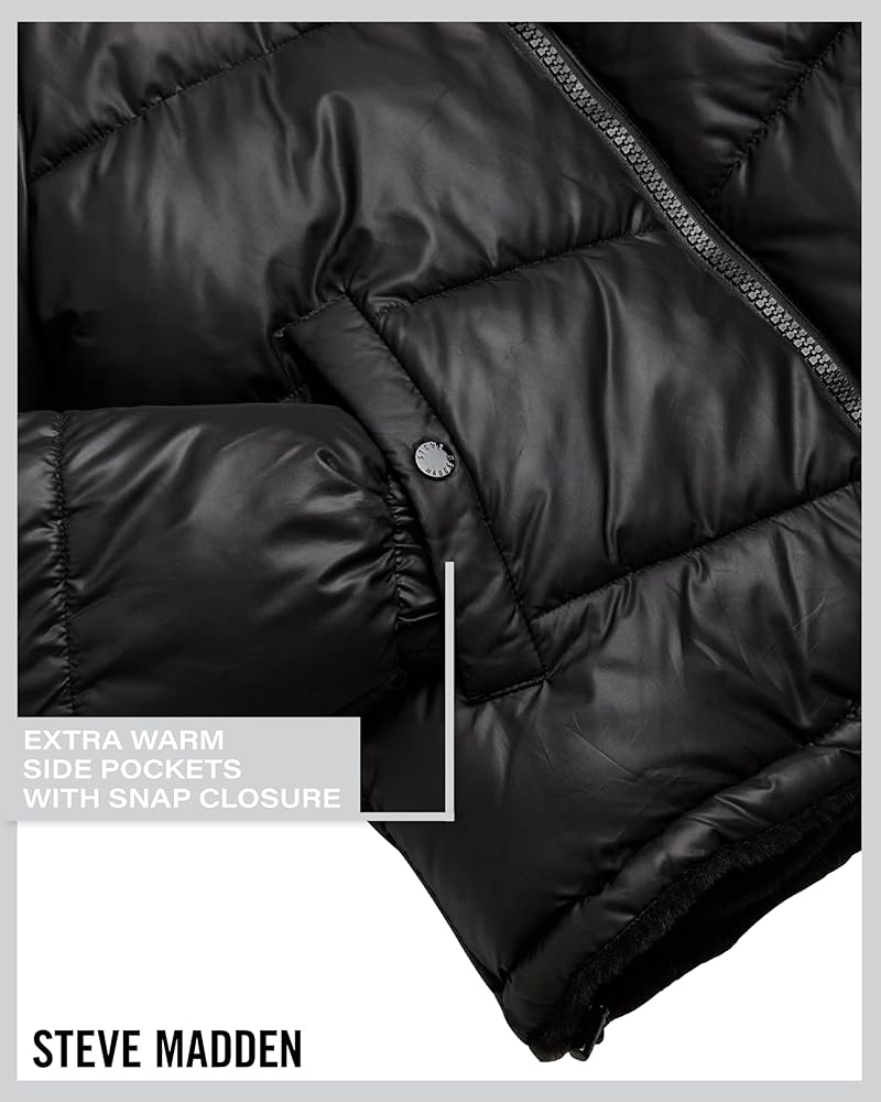 OFFICIALLY LICENSED STEVE MADDEN: Women's Faux Fur Lined Heavyweight Quilted Puffer Parka Coat; Inspired by rock and roll and their New York roots, Steve Madden provides on-trend women and men an outlet to express their individuality with apparel that is innovative, daring, and inspiring
