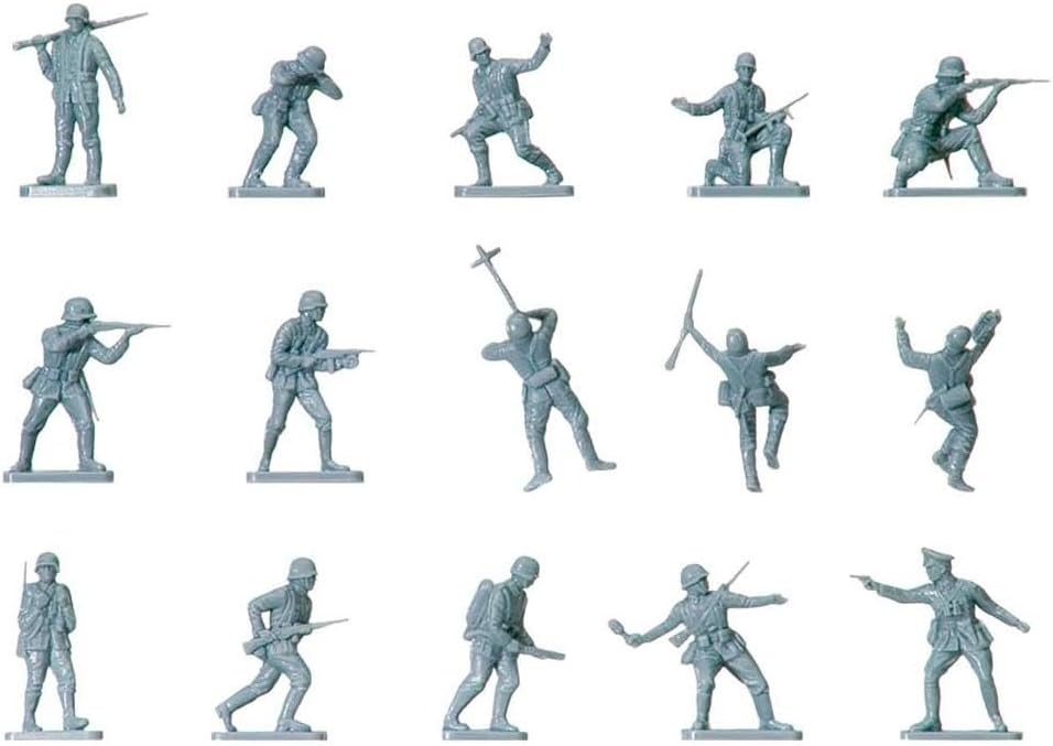 Mold tools were made in 1973, pack illustration by William Stallion in 1973. Enjoy the nostalgia with Airfix Vintage Classics. In the early stages of WWII, the standard German Infantry uniform that was worn consisted of the field jacket, trouser tucked into black leather jackboots, and the characteristically shaped helmet. In the field, soldiers carried equipment including a gas mask case, kit bag, shovel, canteen and ammunition pouch. This set of perfectly scaled figures and equipment includes an officer, grenade throwers and other key personnel from the Wehrmacht.
