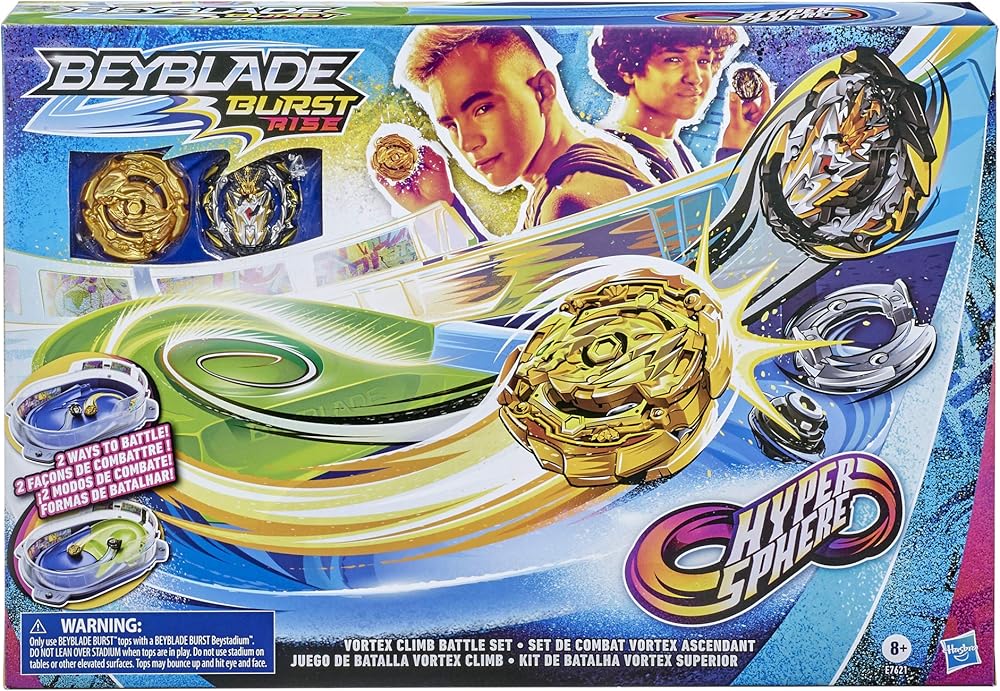 Drop in to victory with Beyblade Burst Rise Hypersphere tech! Hypersphere Vortex Climb customizable Beystadium consists of 4 sections specially designed for exciting Beyblade Burst battles. Climb up the ramp to speed up your attack in the Battle Axis, then drop in from the top level for head-to-head collisions. Get the drop on your opponents for exciting, high-intensity battles!