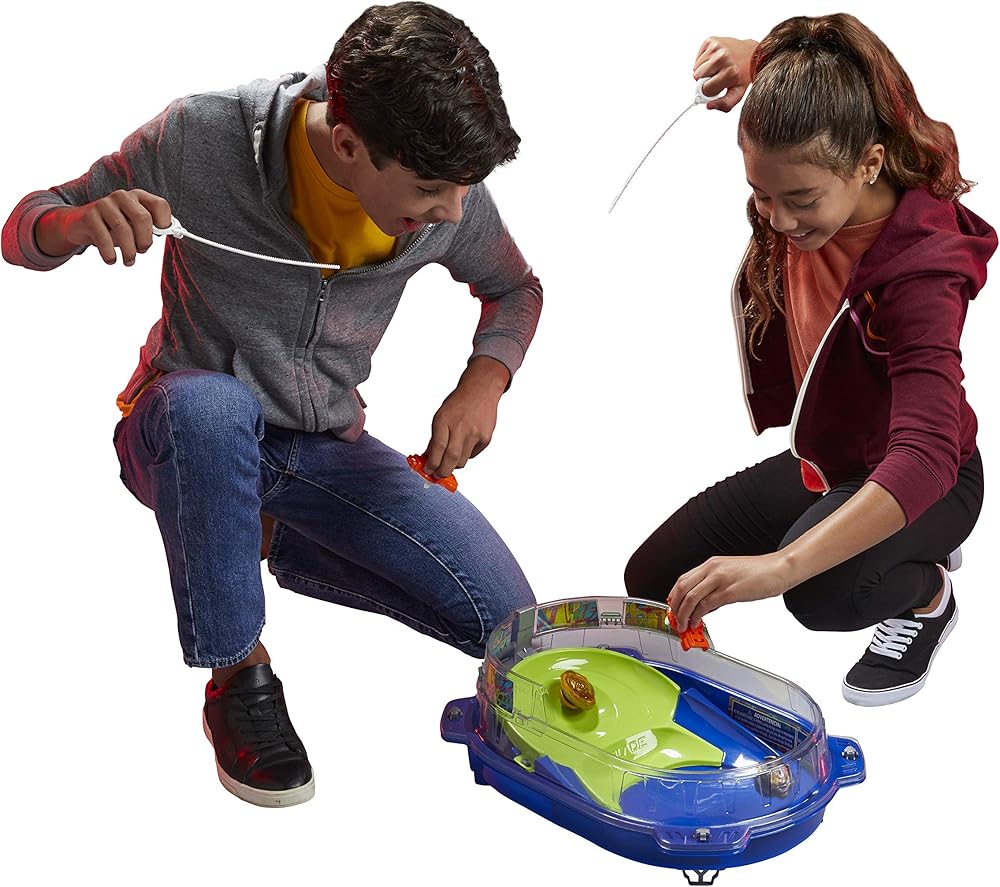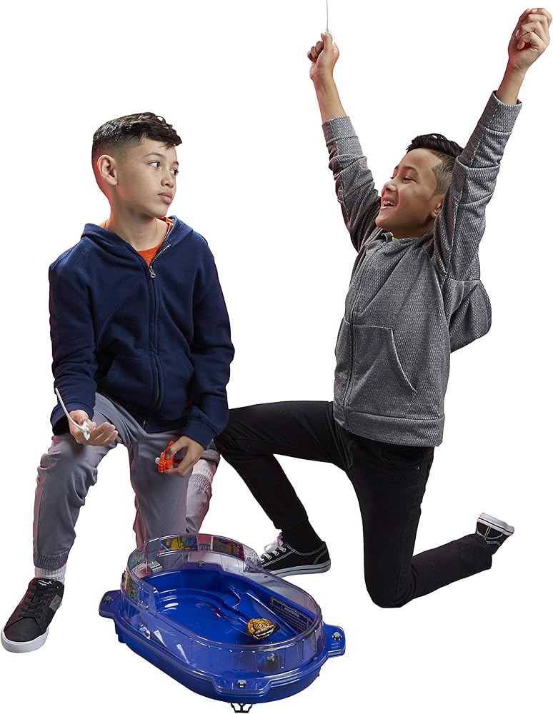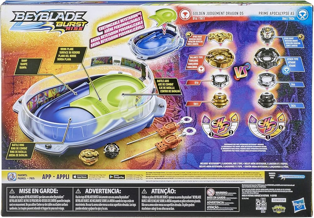 Includes everything needed to battle: Beyblade Burst Hypersphere Vortex Climb customizable Beystadium with removable Battle Axis piece, 2 right/left-spin Beyblade Burst launchers, and 2 Hypersphere battling tops with GT Chips. Go head to head with Golden Judgement Dragon D5 and Prime Apocalypse A5 Hypersphere tops.