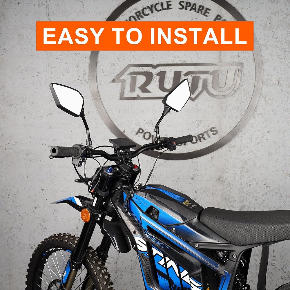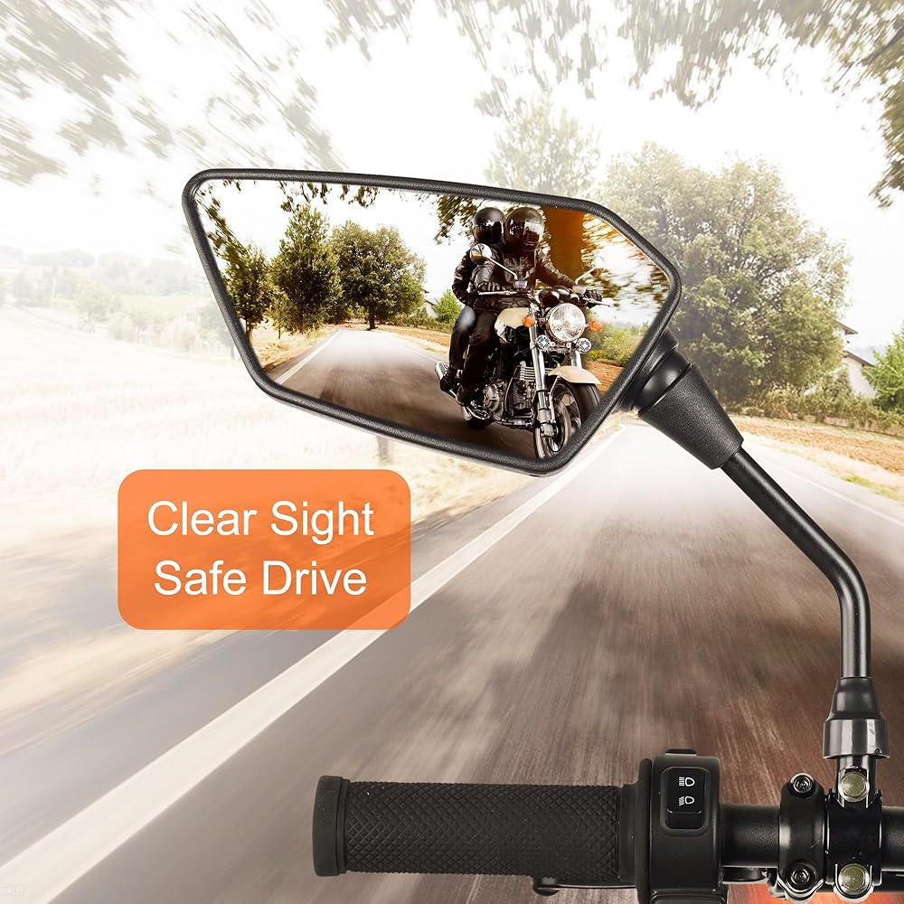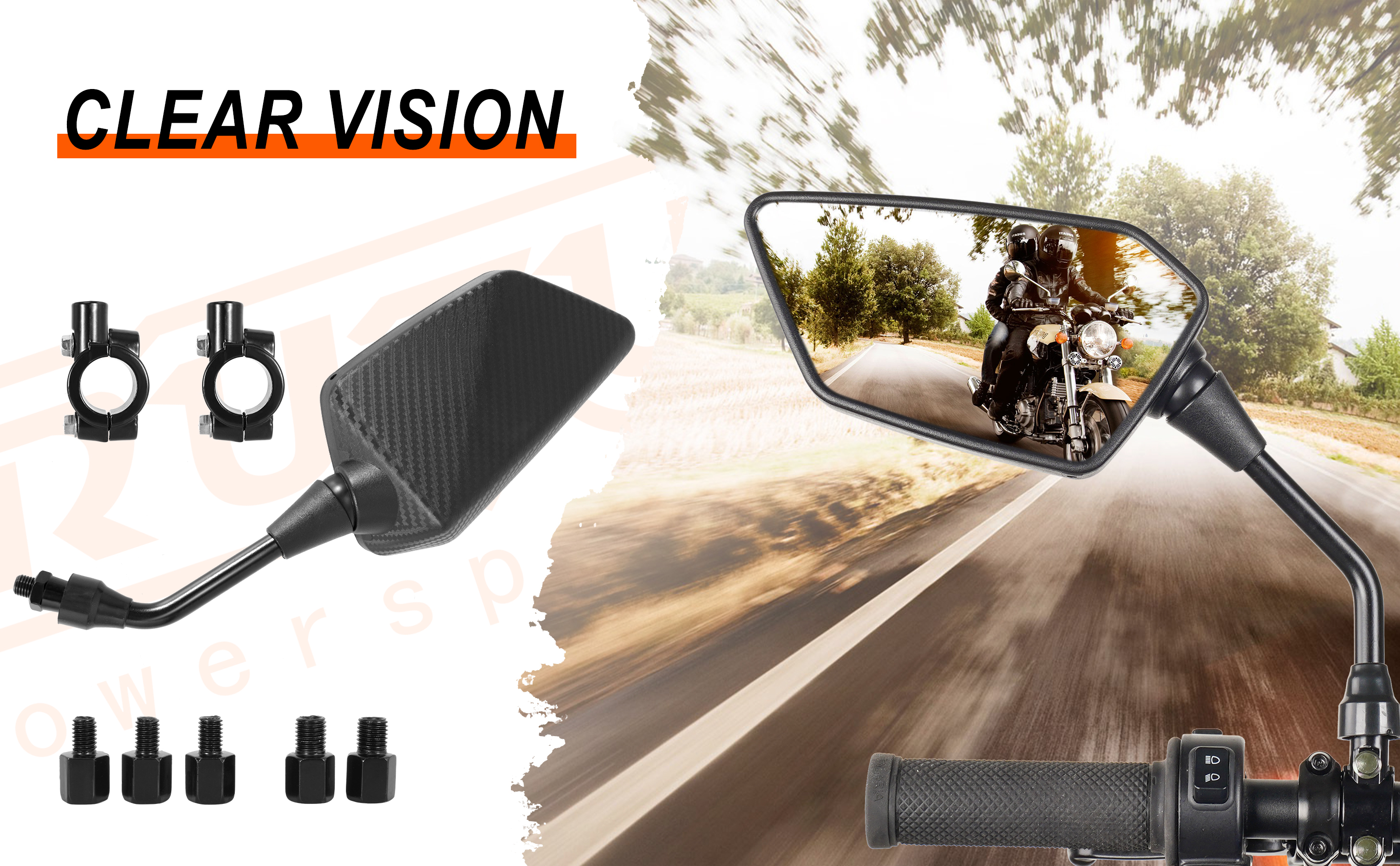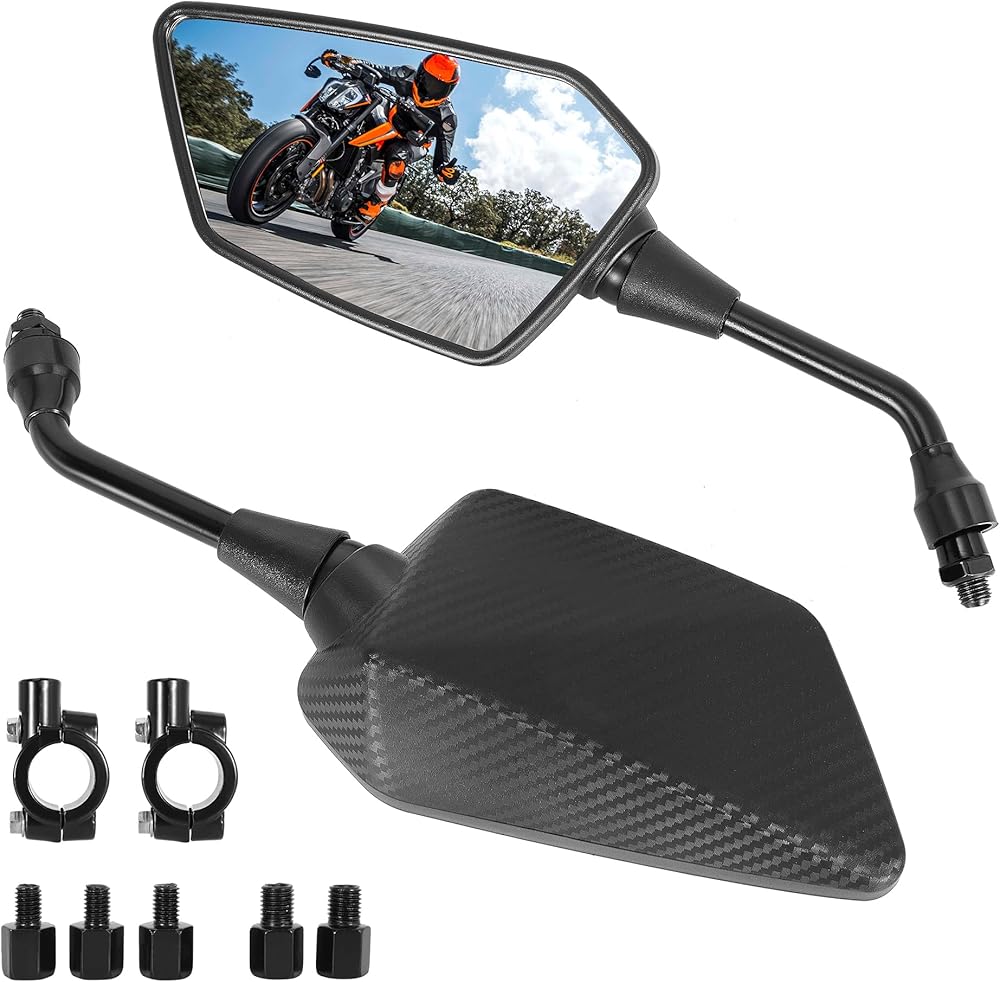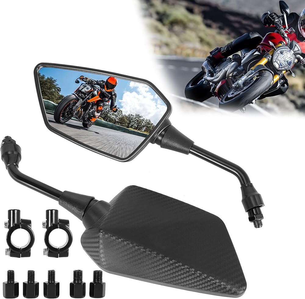 سهلة التركيب: هذه المرايا مجهزة بمرآتين للدراجة النارية (يسار ويمين)، 5 × براغي (1 × 10 مم برغي خيط عكسي، 1 × 10 مم برغي خيط في اتجاه عقارب الساعة، 2 × 8 مم برغي خيط في اتجاه عقارب الساعة، 1 × 8 مم برغي خيط عكسي. ) ، 2 × 7/8 بوصة مشبك تثبيت على المقود. هذه مجموعة كاملة من مرايا الدراجات النارية وملحقاتها للتعديل. فقط استبدل المرايا القديمة المكسورة بها.