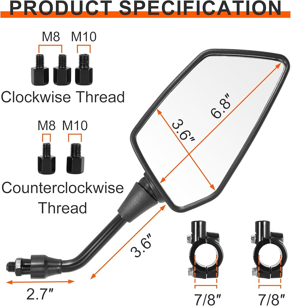 【متوافقة】يمكن تركيب المرايا الجانبية العالمية ATV على معظم الدراجات البخارية أو الدراجات النارية أو الدراجات الرباعية أو ATVs أو عربات الثلوج أو أي قضبان بمقبض مقاس 7/8 بوصة. تنبيه: يرجى التحقق من حجم المسمار قبل تقديم الطلب!