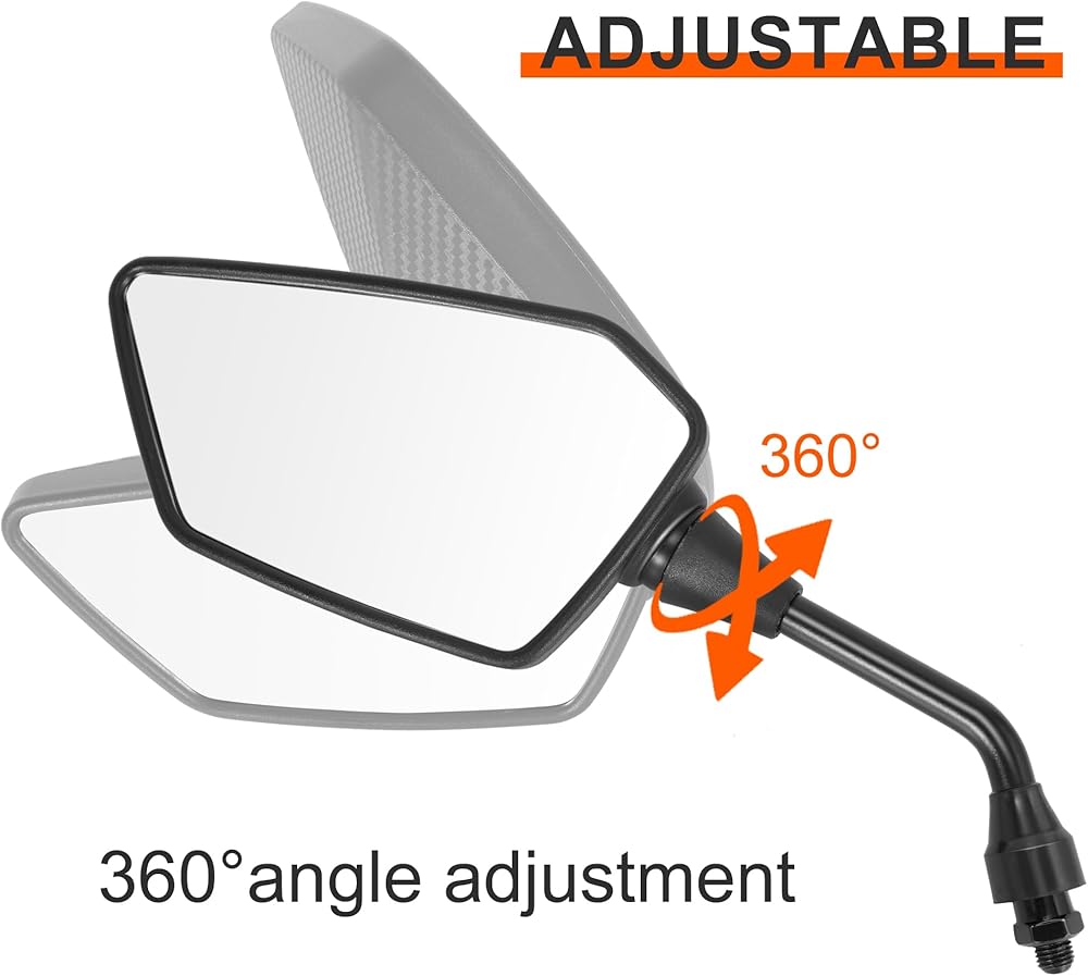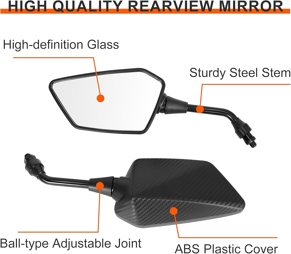 【متينة وعصرية】مرايا ATV مصنوعة من غطاء بلاستيك أكريلونتريل بوتادين ستايرين عالي الجودة، وزجاج عالي الوضوح، وساق من الفولاذ المقاوم للصدأ، وهي مقاومة للخدش، ومتينة، وقوية ومستقرة. تتميز مرايا الرؤية الخلفية للدراجة النارية بتصميم أنيق المظهر، مما يجعل دراجتك النارية أكثر جذاب.