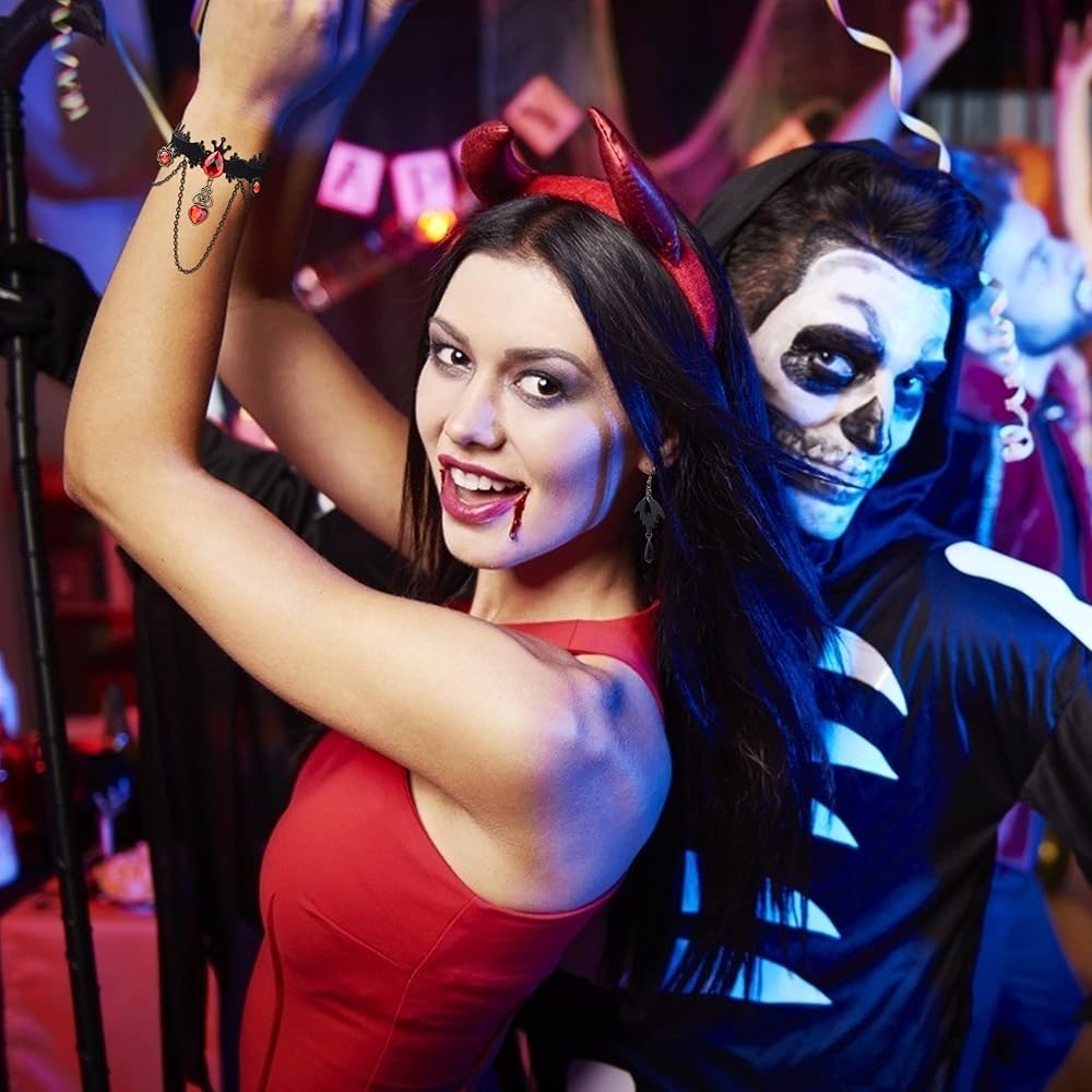 مجموعة أقراط قلادة الخفاش الهالوين: سوف تحصل على 4 جواهر، وقلادة خفاش ذات طبقات، وزوج من أقراط الخفاش المتدلية، وسوار خفاش ياقوتي ذو طبقات وقناع حفلة موسيقية. يعد التصميم ذو الطراز القوطي الداكن مثاليًا لحفلات الهالوين أو الحفلات التنكرية ويمكن أن يخلق مزاجًا احتفاليًا قويًا. يمكن أن تلبي احتياجاتك المختلفة في الملابس