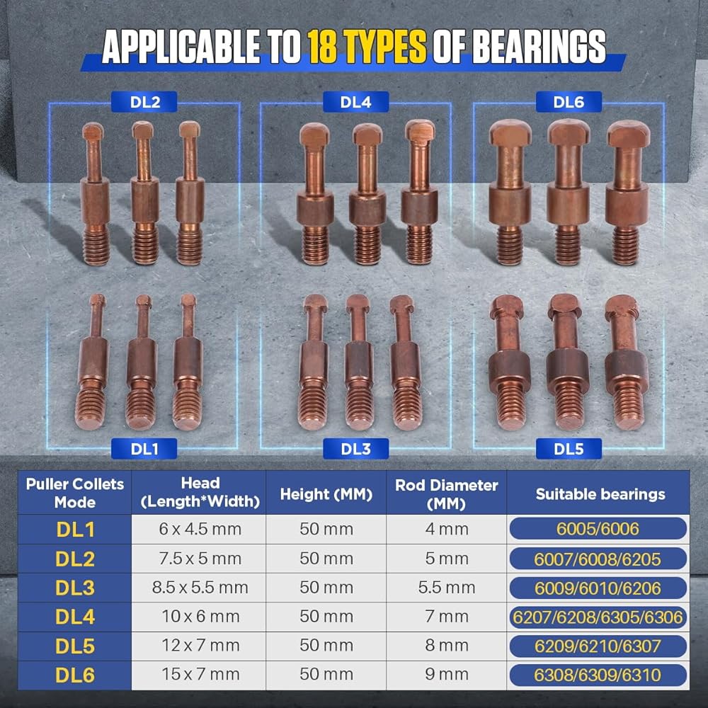 【يستخدم على نطاق واسع - مناسب لـ 18 نموذج محمل】يمكن لساحب المحمل تفكيك المعدات الميكانيكية المختلفة بسهولة، والتي يمكن استخدامها لإصلاح السيارات، ومحامل المركبات غير الحركية، والمحامل الميكانيكية، والآلات الزراعية، وما إلى ذلك، ويمكن أيضًا تفكيك التروس والبطانات. مجهزة بـ 6 أحجام مختلفة من أطواق السحب للتكيف مع أشكال وأحجام المحامل المختلفة، نماذج المحامل القابلة للتطبيق هي: 6005/6006/6007/6008/6009/6010/6205/6206/6207/6208/6209/6210/6305/6306 /6307/6308/6309/6310.