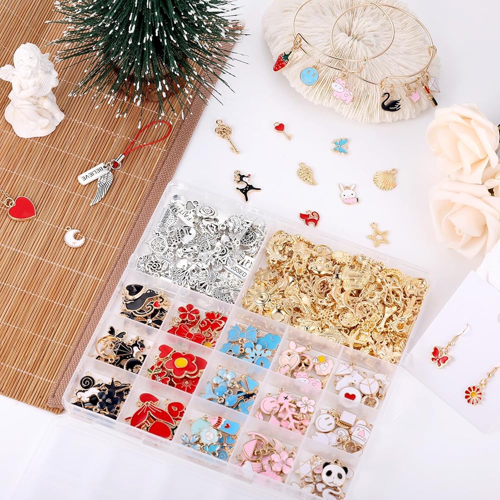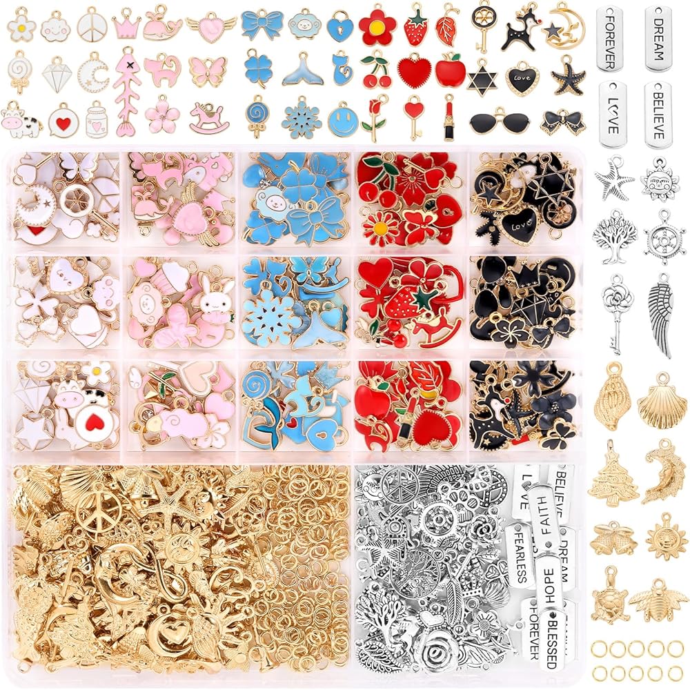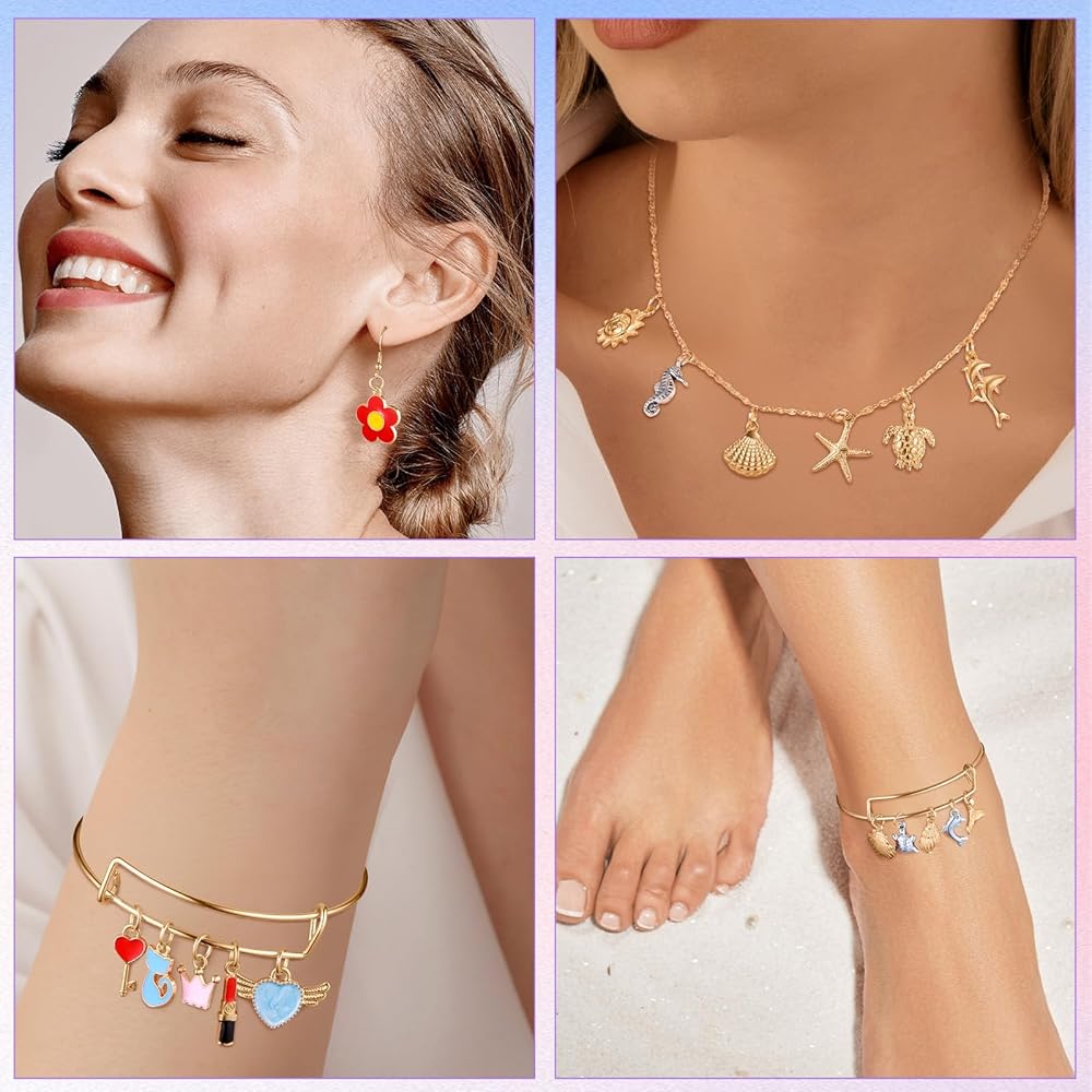 • اختيار متنوع: تتضمن مستلزمات صنع المجوهرات 150 قطعة من حليات المينا الذهبية المتنوعة، و100 قطعة من حليات الذهب KC، و50 قطعة من حليات الفضة العتيقة، و10 قطع من المعلقات الملهمة، و100 قطعة من حلقات القفز الذهبية 5 مم، و100 قطعة من حلقات القفز الذهبية 6 مم.