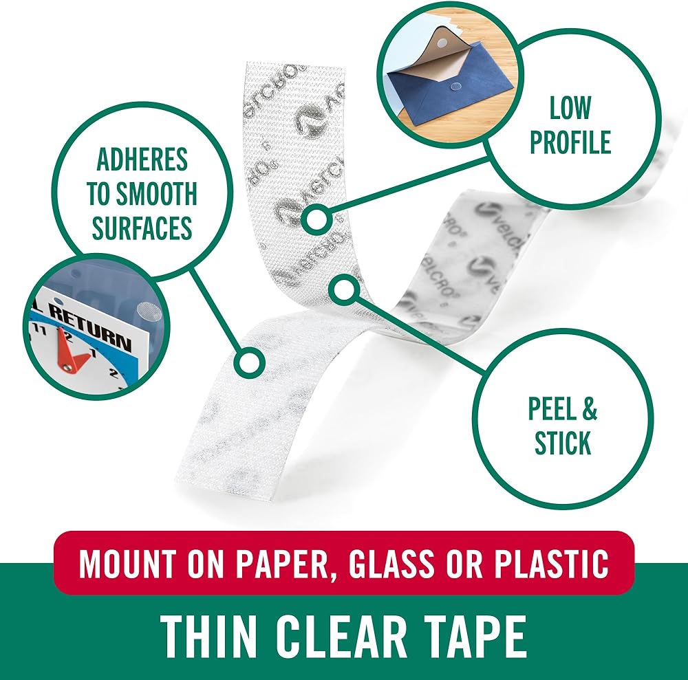VELCRO Brand Thin Clear fasteners blend into glass or plastic surfaces for a seamless look. No color-matching necessary and they are water-resistant for indoor and outdoor use. Mini size fasteners are conveniently sized for small paper crafting jobs such as card making, scrapbooking, and party favors. Better performance and durability than other hook and loop fasteners. Perfect tool for organization around the home, shop, garage, classroom, office and much more!