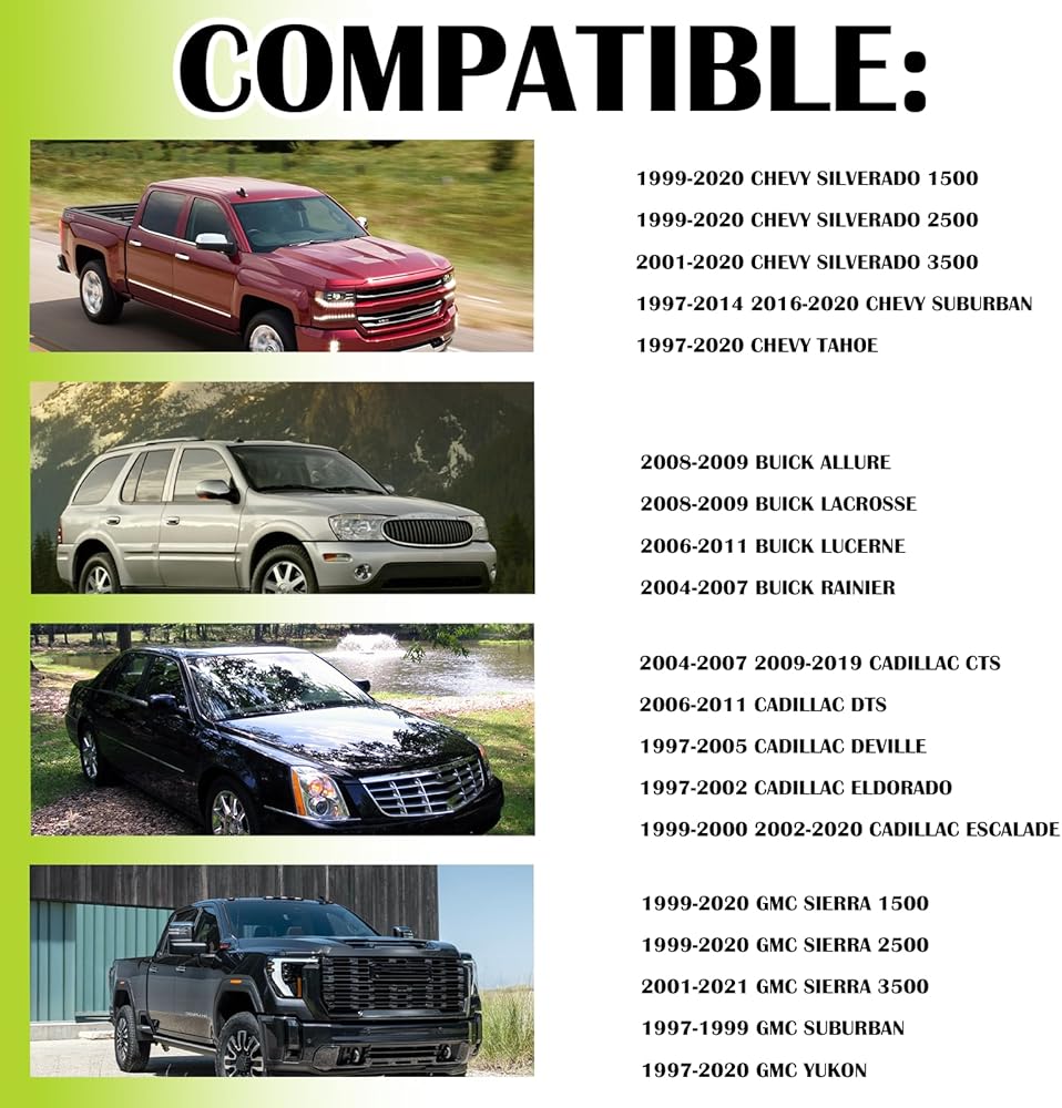 🔺Compatible With Chevy GMC Buick Cadillac Vehicles:🚗1999-2020 Chevy silverado 1500🚗1999-2020 Chevy silverado 2500🚗2001-2020 Chevy Silverado 3500🚗1997-2014 Chevy Suburban🚗1997-2020 2016-2020 Chevy Tahoe 🚗1999-2020 GMC Sierra 1500🚗1999-2020 GMC Sierra 2500🚗 2001-2021 GMC Sierra 3500🚗1997-1999 GMC Suburban🚗1997-2020 GMC Yukon🚗2008-2009 Buick Allure🚗2008-2009 Buick Lacrosse🚗2006-2011 Buick Lucerne🚗2004-2007 Buick Rainier🚗2004-2007 2009-2019 Cadillac CTS🚗2006-2011 Cadillac DTS🚗1997-2005 Cadillac Deville🚗1997-2002 Cadillac Eldorado 🚗1999-2000 2002-2020 Cadillac Escalade