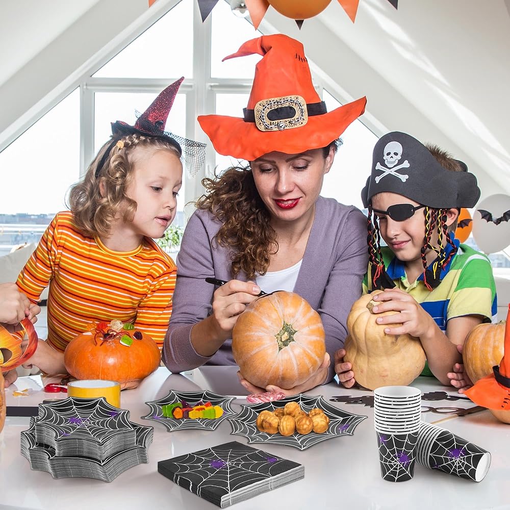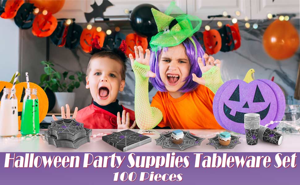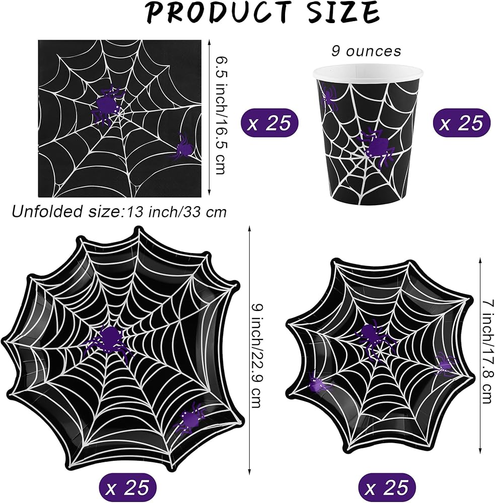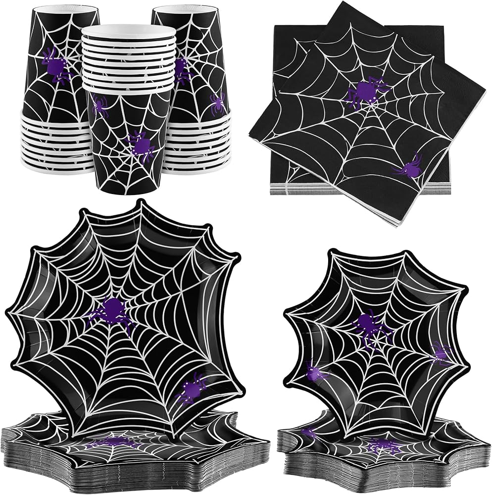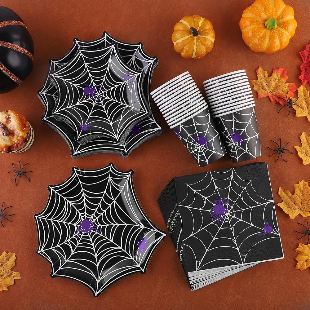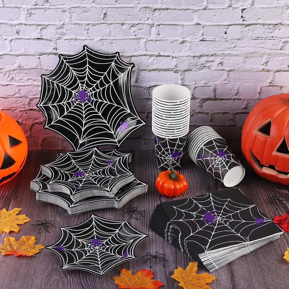 مجموعة أدوات مائدة من Durony 100 قطعة من لوازم حفلات الهالوين على شبكة العنكبوت بما في ذلك أطباق ورق عشاء الهالوين على شكل شبكة عنكبوت وأكواب ومناديل تكفي لـ 25 شخصًا، ديكورات حفلات الهالوين