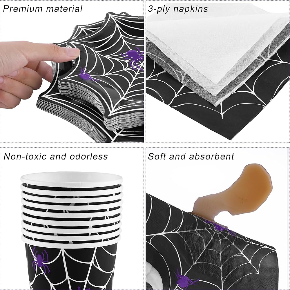 تنظيف خالٍ من المتاعب: مجموعة أدوات المائدة العنكبوتية للهالوين الخاصة بنا مريحة للتنظيف، يمكنك ببساطة التخلص منها بعد الاستخدام، مما يقلل وقت التنظيف ويوفر طاقتك، حتى تتمكن من الاستمتاع بالمزيد من الوقت مع الأصدقاء والعائلة.
