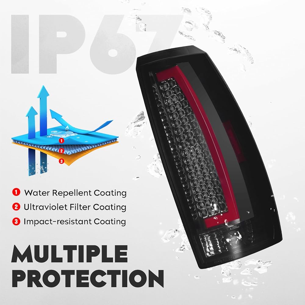 هيكل متين: مجموعة المصباح الخلفي هذه مصنوعة من مواد ABS وPC عالية الجودة مع رغوة عالية الكثافة مثبتة في الخلف، مما يمنع تسرب الماء أو المطر الغزير. مقاومة فائقة لظروف الطقس والبهتان، مقاومة للماء IP67، وحشية مقاومة للماء متضمنة.