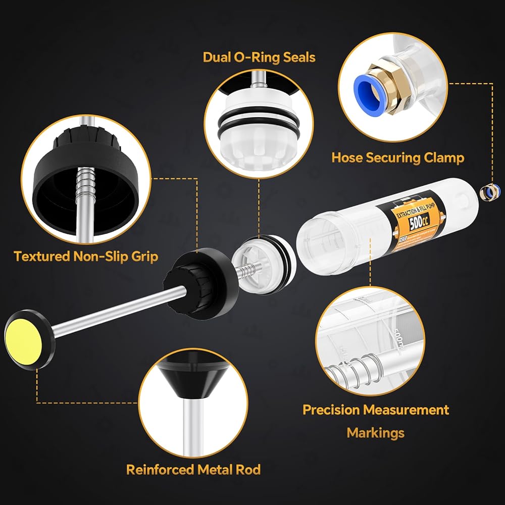 Convenient Hose Attachment: Featuring a quick-connect system, the hose easily attaches to the cylinder, streamlining the extraction process. The pump is equipped with double seals, specifically designed for handling brake fluid and anti-freeze, providing an extra layer of security against leaks. This feature is particularly beneficial when dealing with corrosive or sensitive fluids.