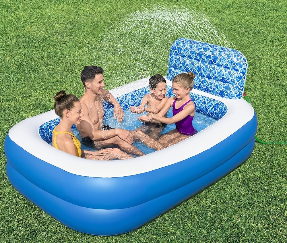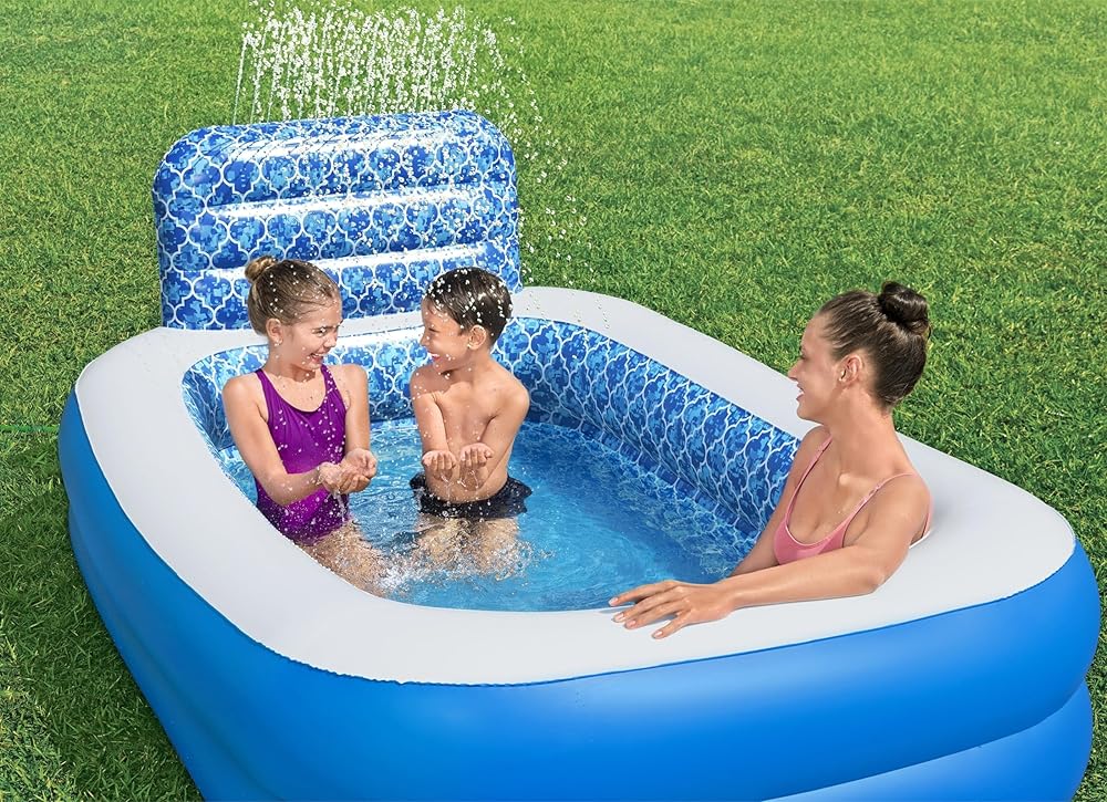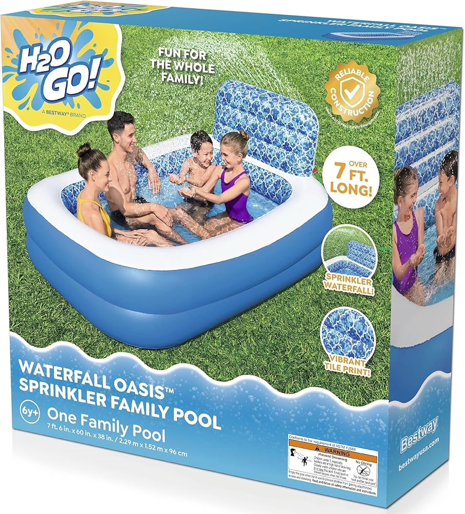BEAT THE HEAT: Create a summer of zen in your own backyard with the Bestway H2OGO. Waterfall Oasis Inflatable Sprinkler Family Pool. The kids pool is designed for families with children ages 6 and up.