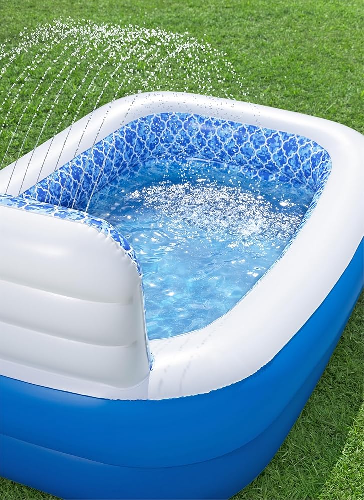 BUILT-IN SPRINKLER: This inflatable swimming pool features a unique, blue mosaic tile print and a sprinkler wall that functions as a relaxing water feature or another way to cool off.