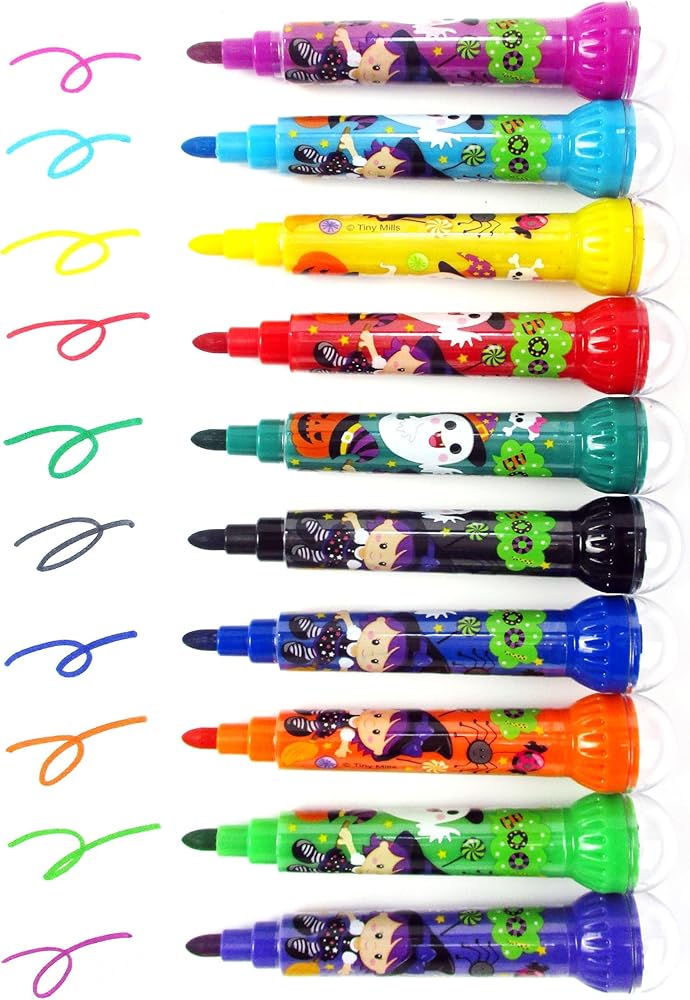 Bring the spooky spirit of Halloween to your arts and crafts with this vibrant Stamp Color Marker set from Tiny Mills. With 10 bold and festive colors like purple, blue, yellow, red, green, orange, and more, these markers let you create ghoulishly fun designs featuring pumpkins, cats, skulls, and other eerie elements. The stamp markers are easy to use, making them perfect for kids over 3 years old to unleash their creativity. The set comes in a handy box adorned with Halloween imagery to keep the markers organized. Get into the haunting holiday mood and let your little ones' imaginations run wild with these colorful, themed stamp markers.