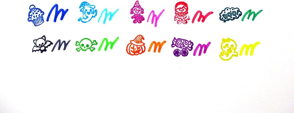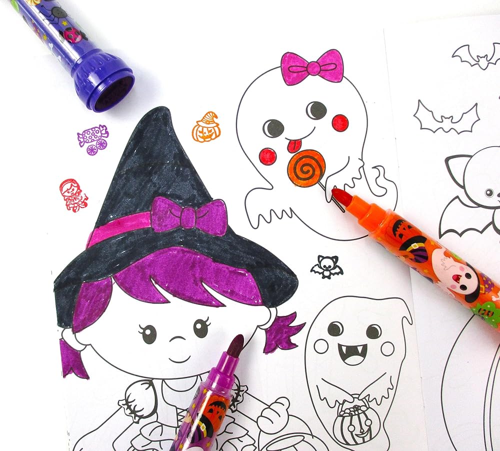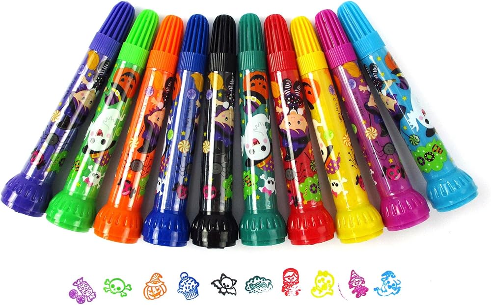 Festive Stamper Set: This 10-piece stamp color marker set features vibrant Halloween-themed designs like pumpkins, cats, and bats - perfect for creative fun!