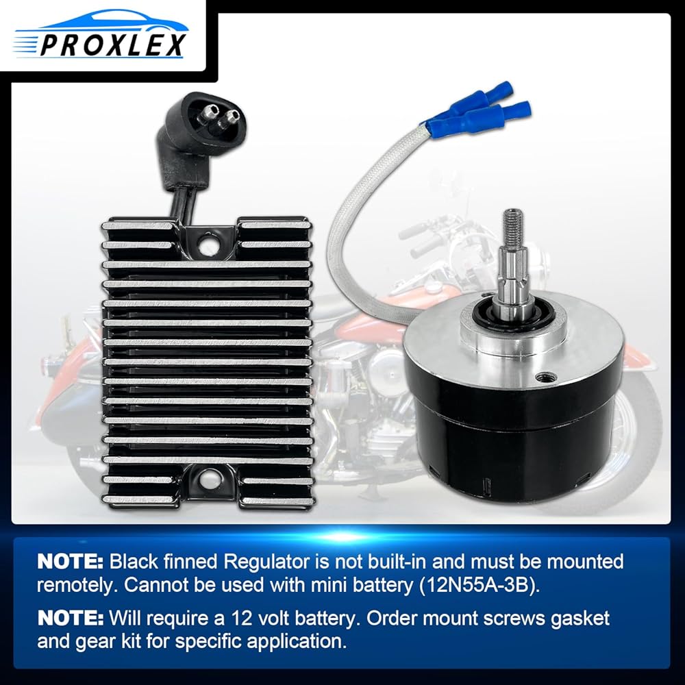 【ملاحظة】: المنظم ذو الزعانف السوداء غير مدمج ويجب تركيبه عن بعد. لا يمكن استخدامها مع بطارية صغيرة (12N55A-3B). سوف يتطلب بطارية 12 فولت. اطلب حشية براغي التثبيت ومجموعة التروس لتطبيق محدد.