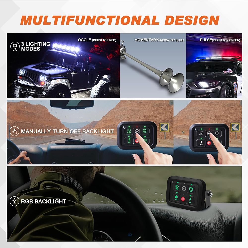 متعددة الوظائف: تتميز لوحة مفاتيح الشاحنة بوظائف مختلفة التعتيم التلقائي، وإيقاف الإضاءة الخلفية بلمسة واحدة، وتعديل الإضاءة الخلفية RGB، و3 أوضاع إضاءة؛ يمكن أن يتكيف التعتيم التلقائي وإيقاف الإضاءة الخلفية بلمسة واحدة بشكل أفضل مع ظروف الإضاءة المختلفة