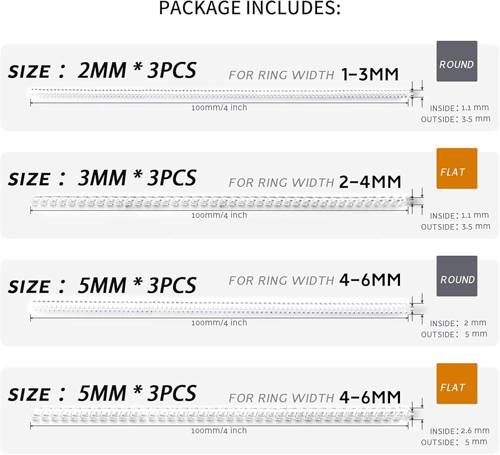 ELETIUO Ring Size Adjuster for Loose Rings,Scratch Proof Ring Sizer Adjuster, Transparent Invisible Silicone Guard Clip Noodle Jewelry Tightener Resizer 12 Spirals 4 Size Fit Almost Any Ring Size for Men and Women