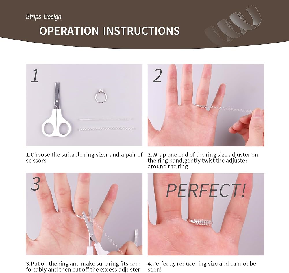3. Put on the ring and make sure ring fits comfortably and then cut off the excess adjuster 4. Perfectly reduce ring size and cannot be seen!