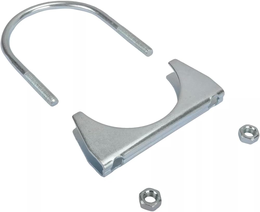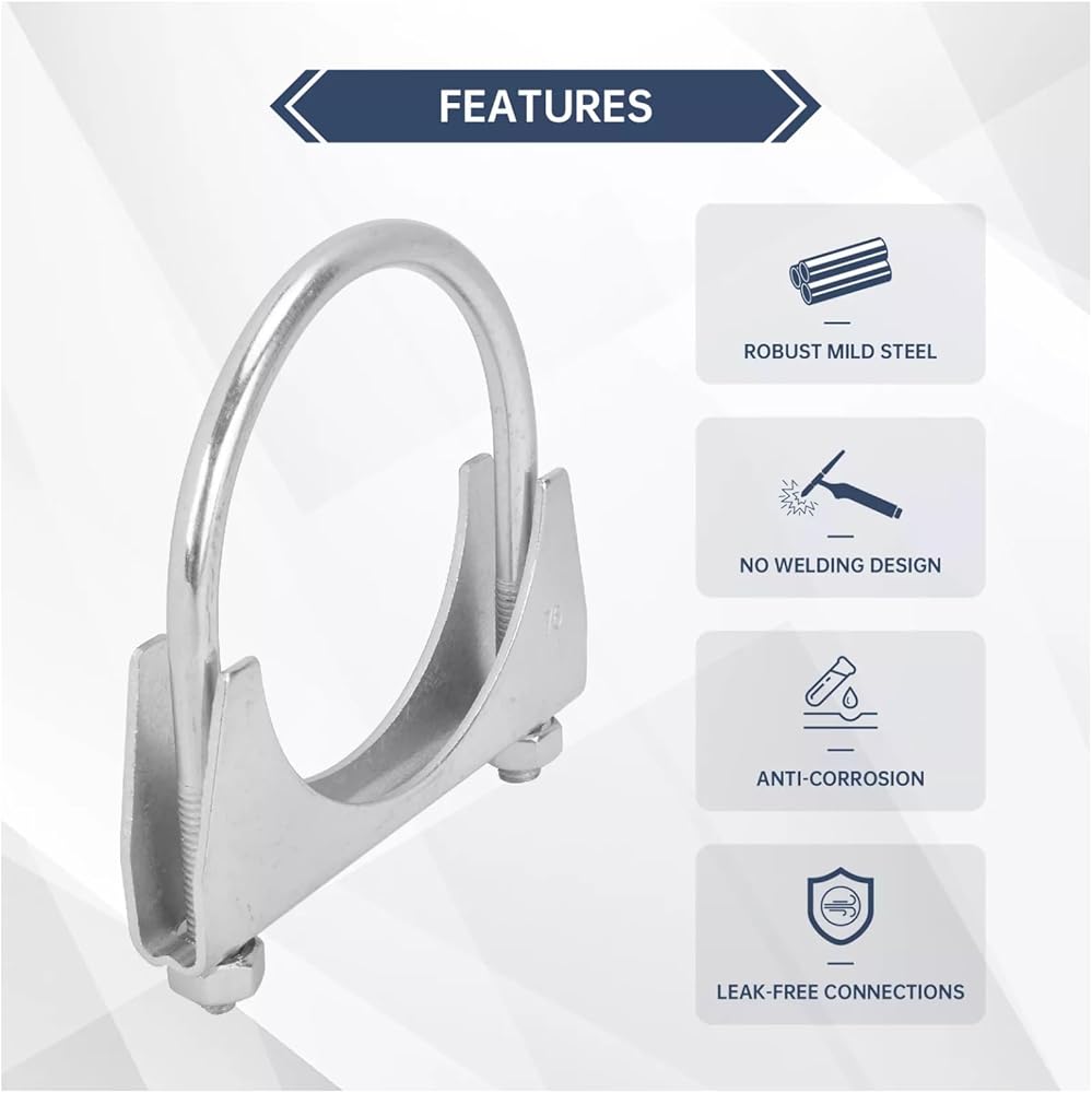 التصميم: تتكون المشابك ذات المسمار على شكل حرف U من مسمار على شكل حرف U، وشفة سرج وجوزتين، ويضمن التصميم على شكل حرف U أن المشبك يمكنه تحمل الضغط والحرارة الناتجة عن نظام العادم، وسهل التركيب، وقابل للإزالة .