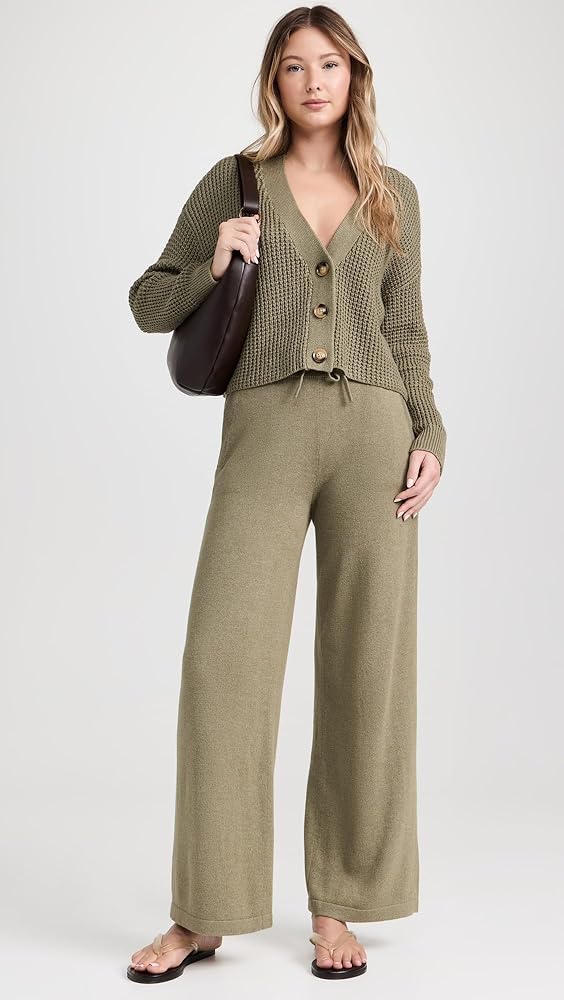 Let's get cozy. Made from recycled cotton, acrylic, and recycled polyester, this sweater pant is soft and fit for comfort with its elastic waistband with drawstring and front pockets. Pair with the matching cropped tank and cropped cardi for a morning coffee run, or gift the full set to your favorite person who loves softness (and the planet) just as much as you.
