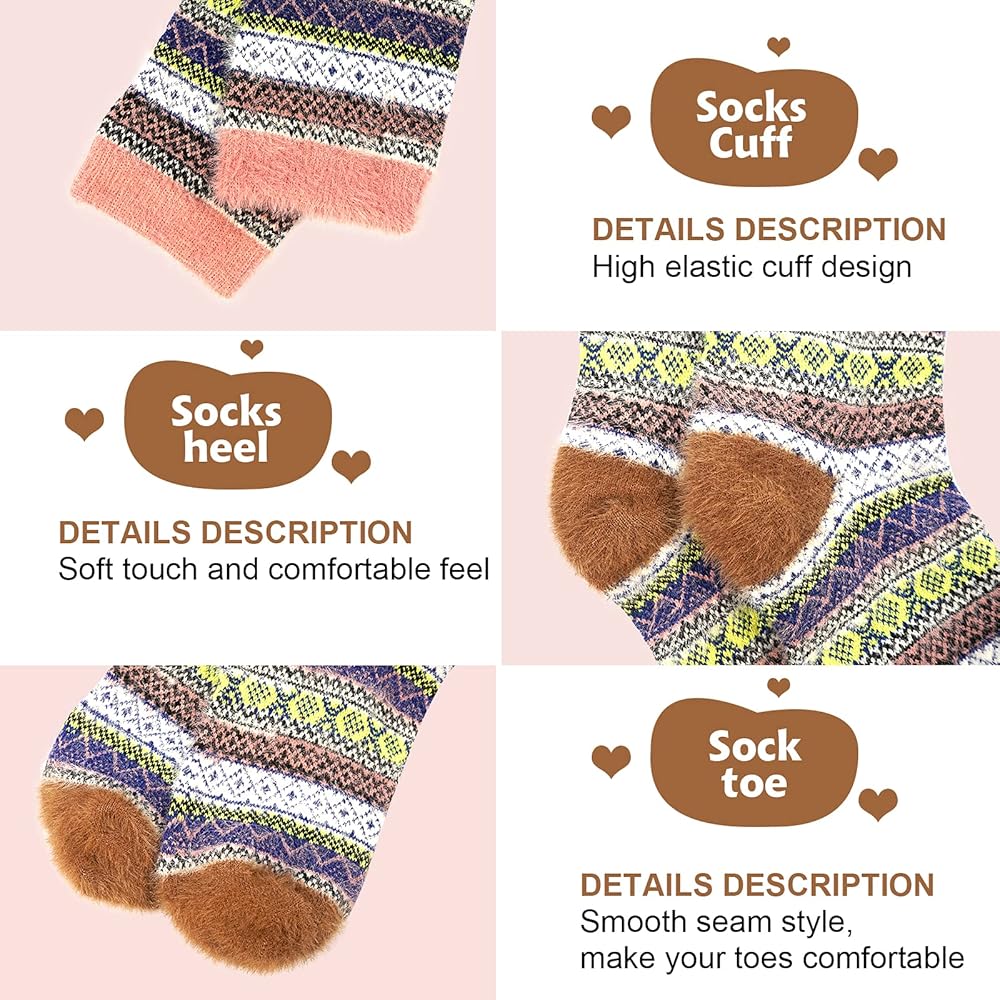 【تصميم أنيق】النمط العتيق رائع وممتع مع مزيج من المطبوعات الزاهية. ألوان مختلفة من الجوارب السميكة الشتوية الدافئة ذات تصميم عتيق وعصري، يسهل تنسيقها مع ملابسك اليومية. يمكن لهذه الجوارب الطويلة اللطيفة أن تبقي أصابع قدميك دافئة وتضيء صباح الشتاء البارد.