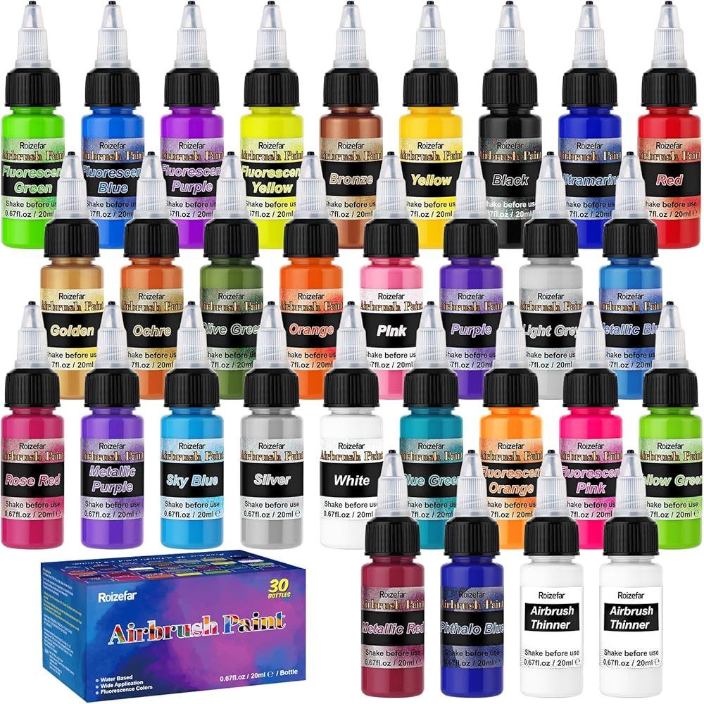 مجموعة طلاء البخاخة: تحتوي مجموعة فرشاة البخاخة Roizefar على 44 لونًا، بما في ذلك 24 لونًا كلاسيكيًا، و6 ألوان نيون، و6 ألوان معدنية، و8 ألوان قزحية، كما تأتي مع 6 ألوان أرق للفرشاة الهوائية. سوف تلبي مجموعة متنوعة من الأصباغ معظم متطلبات الطلاء الخاصة بك دون الحاجة إلى عملية خلط. كل زجاجة 20 مل.